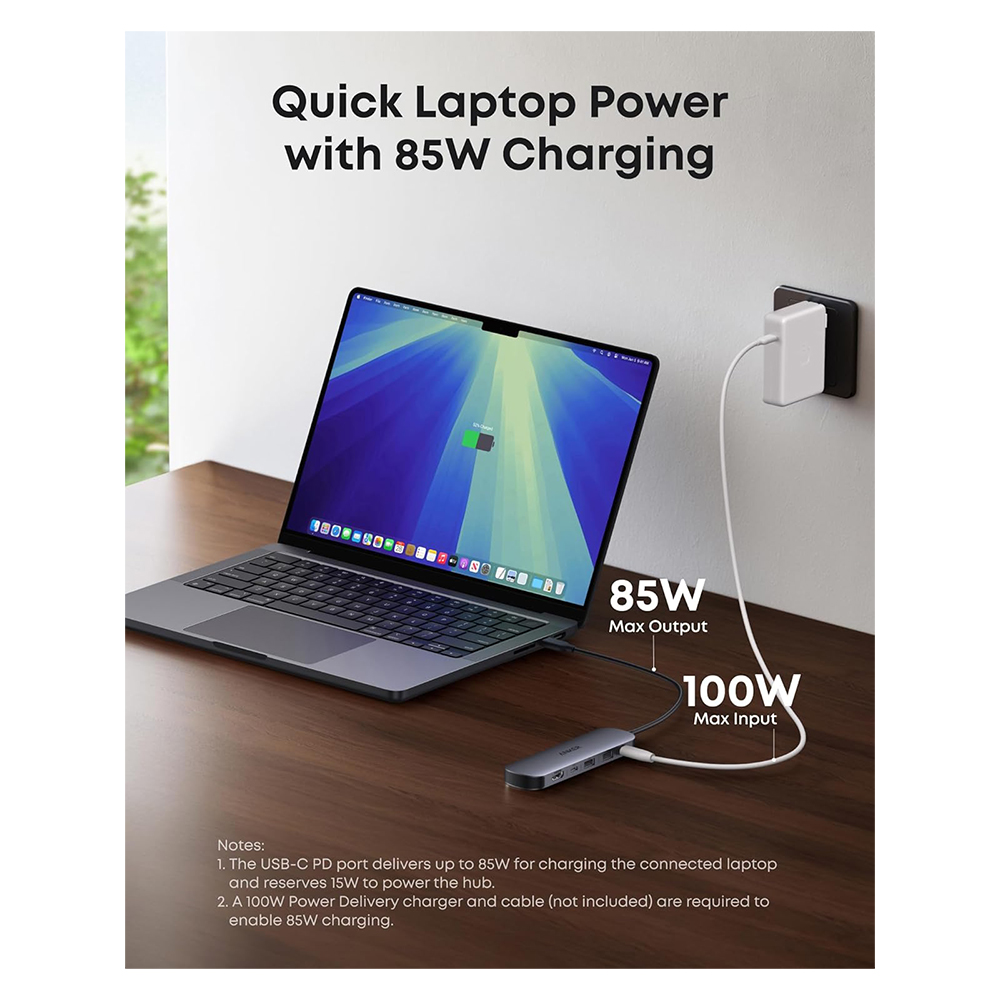 1. The USB-C PD port delivers up to 85W for charging the connected laptop and reserves 15W to power the hub.