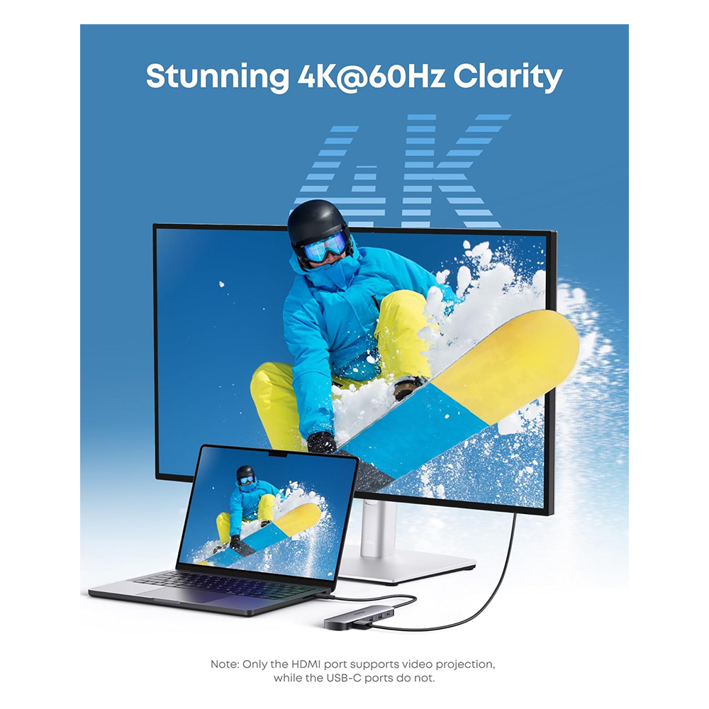 This hub brings together a 4K@60Hz HDMI port, two USB-A 3.0 ports, a USB-C data port, a USB-C PD input port, and dual SD and TF card slots, making it an indispensable gadget for modern professionals.