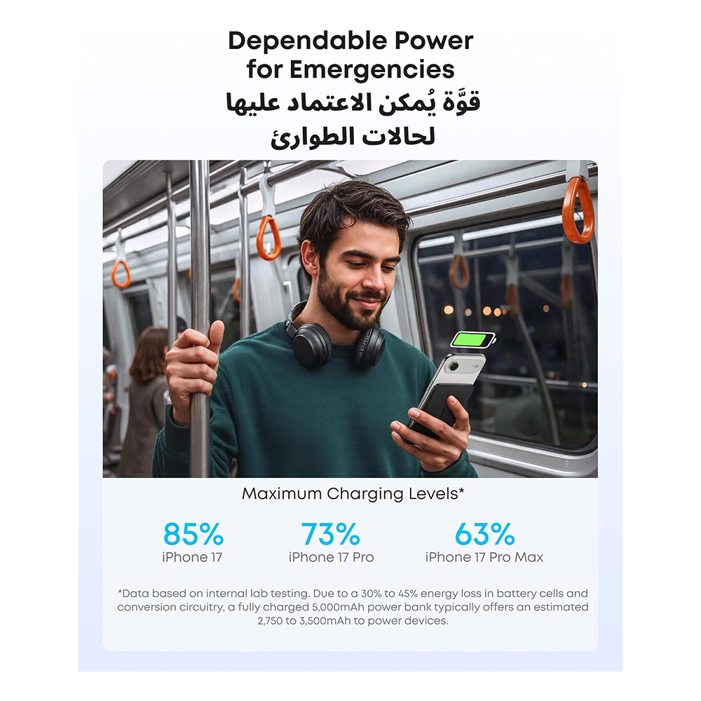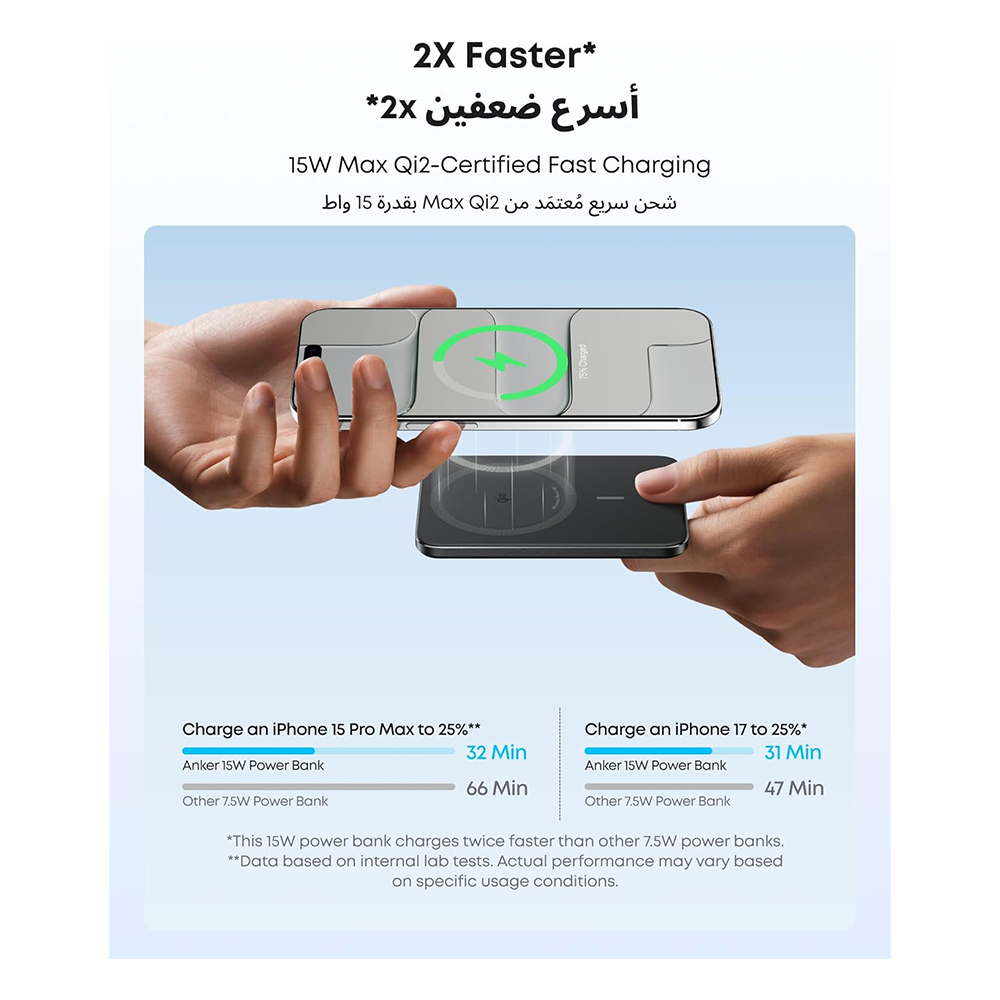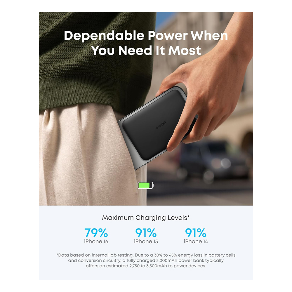 • 15W MagSafe-Compatible Charging: With 15W Max MagSafe-compatible fast charging, Anker Nano Power Bank provides high efficiency for mobile charging, quickly powering up an iPhone 16 Pro to 25% in just 42 minutes. (Data based on internal lab tests; actual charging performance may vary.)