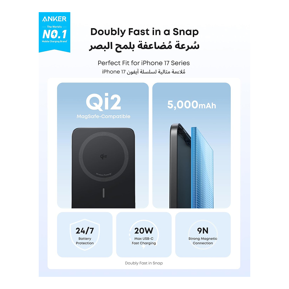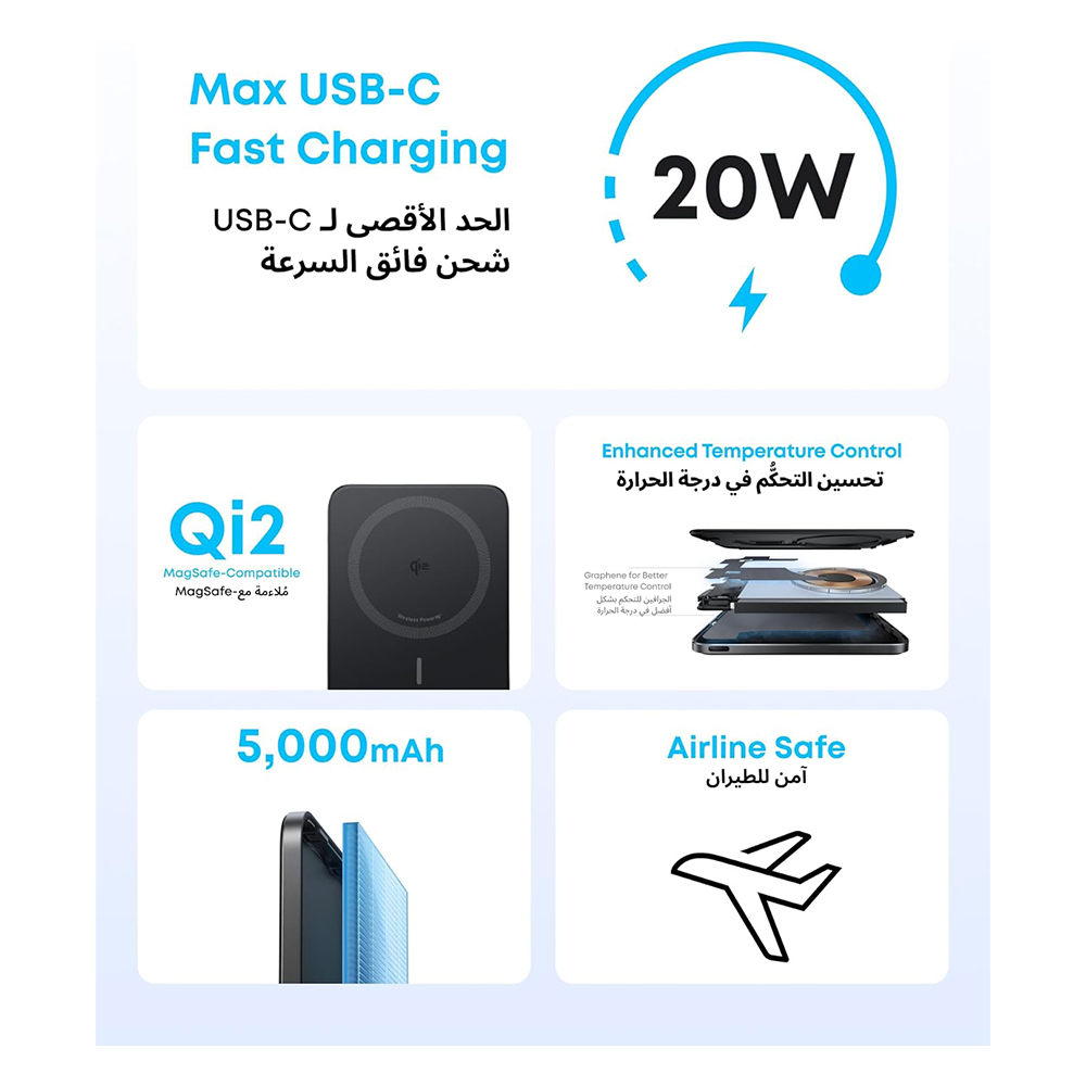 • Enhanced Safety and Speed: Offering high-speed charging and enhanced safety, the power bank features Qi2 MagSafe compatibility, continuous battery protection, and powerful 20W Max USB-C charging.