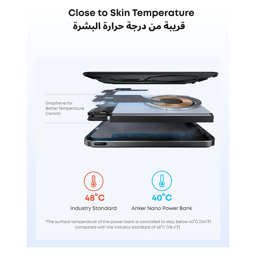 • 104℉ for Safer Handling: With the exceptional cooling benefits of graphene, dual NTC chips, and smart charging adjustments, this power bank stays below 104℉, 14 degrees cooler than the industry standard, for safer and more reliable charging performance.