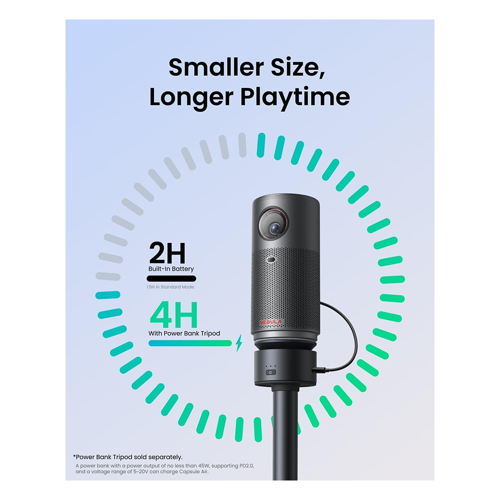Watch for 2 hours with the built-in battery or 4 hours with the Capsule Power Bank Tripod to Enjoy a full movie or several episodes of your favorite show wherever you are.
