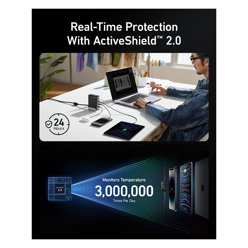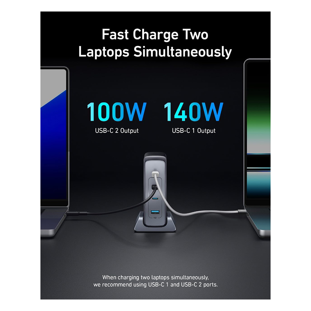 Unleash 240W of Super Power: With one USB-C port providing up to 140W, and the other three ports sharing 100W, charge up to 4 devices simultaneously with a maximum output of 240W. Dual Laptop Fast Charging: Power two laptops at the same time, with the USB-C 1 port delivering 140W, and the USB-C 2 port providing 100W. Safety First with ActiveShield 2.0: Provides real-time safety by monitoring temperature around the clock, performing 3 million checks every day to ensure optimal charging performance. Keep It Neat and Powerful: The charger’s compact design with a detachable charging base ensures a clutter-free workspace while delivering efficient charging. What You Get: Anker Prime 240W GaN USB-C Charger (4 Ports), detachable base, welcome guide, our 18-month quality assurance, and friendly customer service.