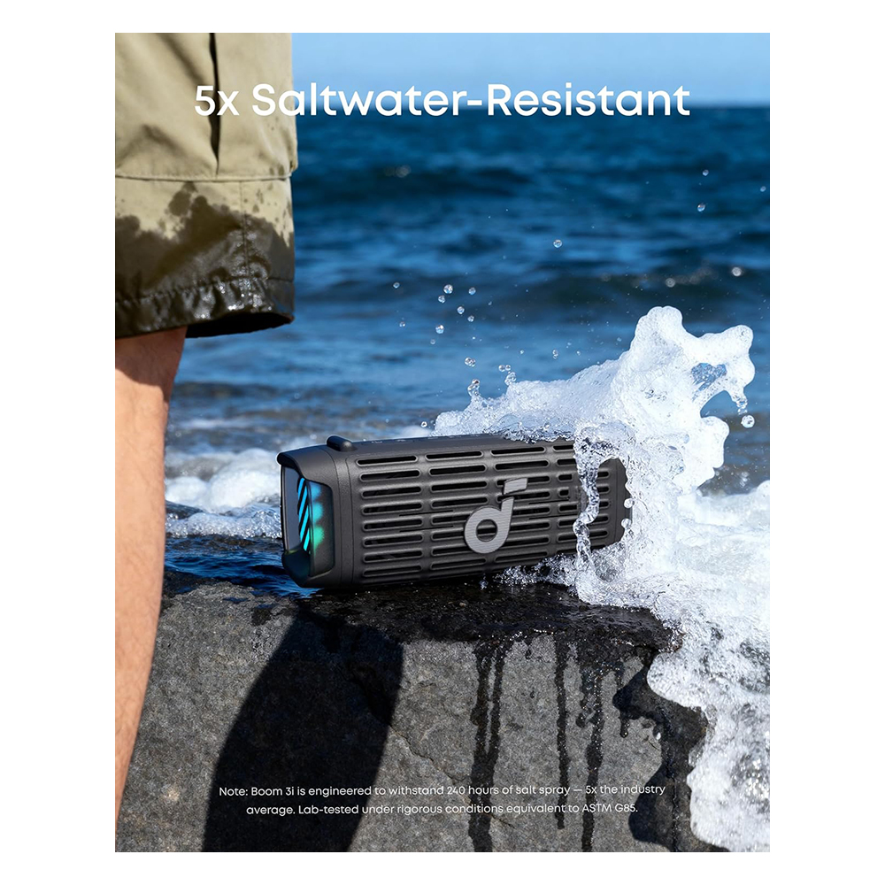 Boom 3i is built for the elements-with a rugged casing and protective coating that defends against seawater, sweat, and salt spray. While typical speakers may rust in under 5 months, Boom 3i stays corrosion-free for up to 2 years of beach, boat, and seaside use.Note: Engineered to withstand 240 hours of salt spray-5x the industry average. Lab-tested to ASTM G85-equivalent conditions.