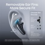 The semi-in-ear fit with detachable ear fins provides a secure, pressure-free experience, reducing pressure and heat build-up in the ear compared to traditional in-ear designs.