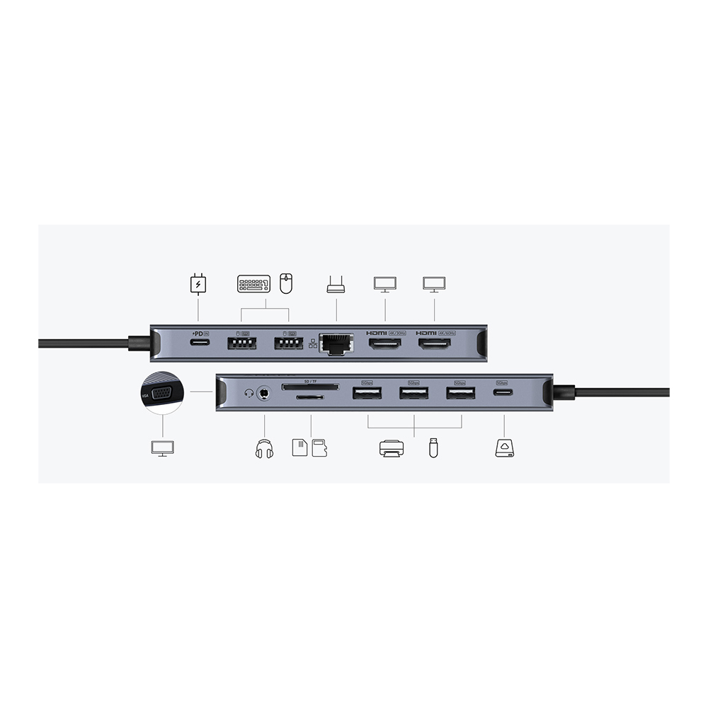 Turn your work desk into a visual powerhouse, streaming content on up to three screens in impeccable 4K clarity through two HDMI ports and a 1080p VGA port.