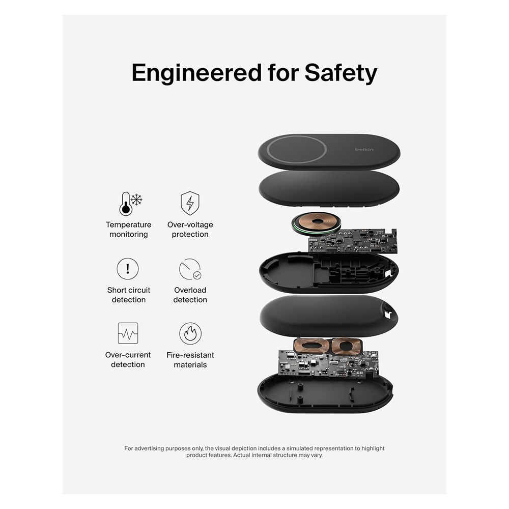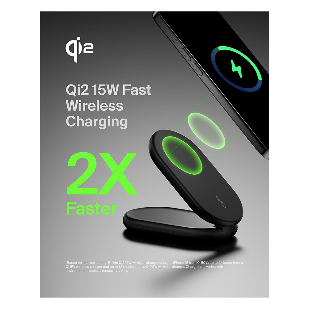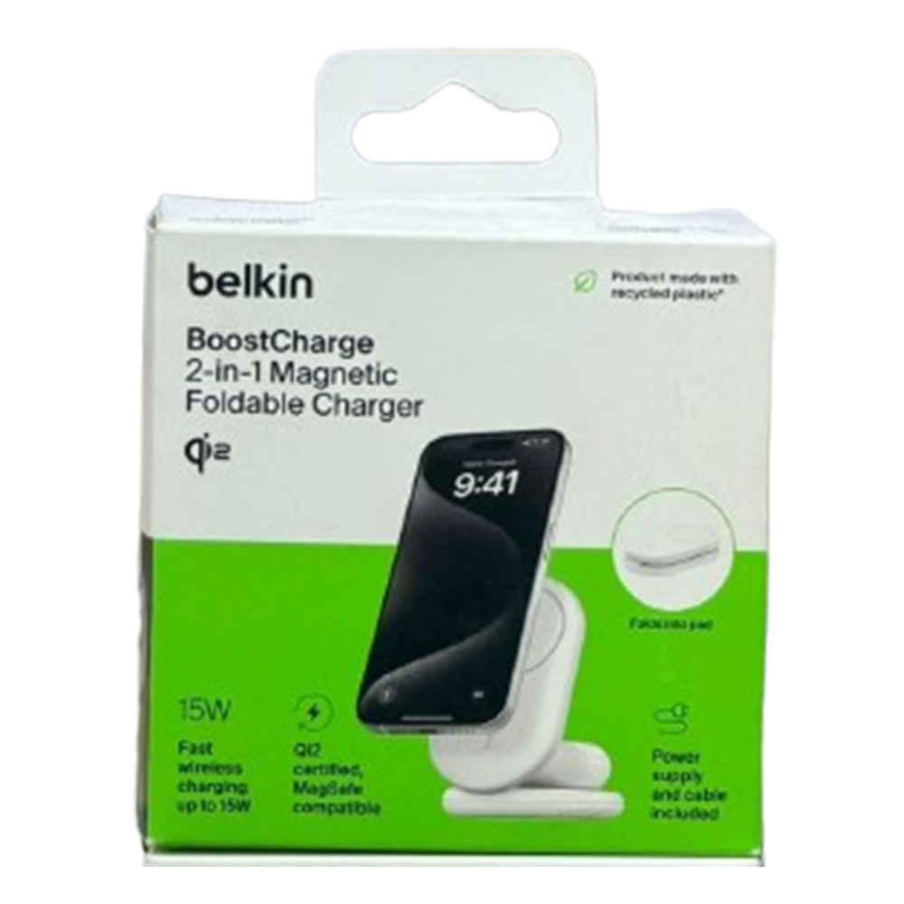 The Belkin BoostCharge 2-in-1 Magnetic Foldable Charger lets you fast charge your iPhone or Qi2 compatible device up to 15W. Its Qi2 technology also optimizes energy usage and safeguards the device’s battery life. MagSafe-compatible, this versatile charger makes powering your iPhone easier than ever – ensuring proper placement with a simple ‘click’ in place. Plus, you can charge your AirPods at the same time! Purchase yours with peace of mind, as it comes with a 2-year warranty and $2,500 Connected Equipment Warranty (CEW). DISCLAIMER: Belkin’s Qi2 portfolio is certified to deliver fast magnetic wireless charging up to 15W for Qi2-enabled devices and accessories. *Compatible with Samsung S25 Series when using a Qi2 certified case. **Based on internal testing. Belkin Qi2 15W wireless charger charges iPhone 15 from 0-50% up to 2x faster than a Qi 5W wireless charger and up to 1.5x faster than a Qi 7.5W wireless charger. Charge time varies with environmental factors; results may vary. Belkin is an established accessories market leader creating high-quality, innovative tech solutions for 40 years. Specifications: 15W fast charging – Qi2 MPP certified 5W BPP Qi pad Compatibility: Universal compatibility supports fast charging of most PD3.1 (EPR) / PD3.0 enabled devices including iPhones and Qi2 compatible devices such as iPhone 15 Pro Max, iPhone 15 Pro, iPhone 15 Plus, and iPhone 15, Google Pixel 10 Pro XL, Google Pixel 10 Pro Fold, Google Pixel 10 Pro, Google Pixel 10, and more. Made with 75% post-consumer recycled materials and 100% plastic-free packaging 2-year warranty $2,500 CEW Package Includes: BoostCharge 2-in-1 Magnetic Foldable Charger 30W USB-C PSU. Review: Perfect stand for Samsung Galaxy 26+, Ultra & Buds4 Pro also. Fast charging & NO heating at all! – Compatible with Samsung. It works great with my Android phones, Samsung Galaxy 26+ and Galaxy 26 Ultra. Fits perfect vertical or horizontal with the stand at 45 deg. As with any Samsung phone, it needs a MagSafe case to attach magnetically. Fast charging and no overheating at all. Samsung Ear buds 4 pro fit nicely and charge on the secondary pad. I bought two of these and they look and work perfectly on our night stands. This is a reputable brand designed in the US and built in Vietnam. Solid and good quality materials and workmanship. Good value for the price, I like it that much that I would buy it again as a gift. I’ll update this review if they fail prematurely but I doubt it. Belkin is a very good brand overall. Review: Great charger – Great charger. Magnet works exactly as it should, the design is sleek on my desk, and the power throughput is as advertised.
