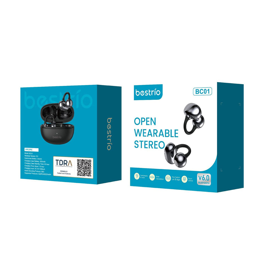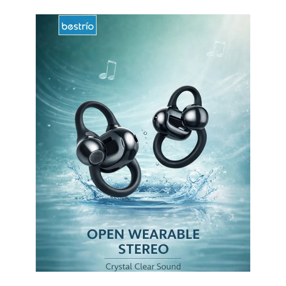 Experience superior audio with the Bestrio BC01 Open Wearable Stereo headphones. These innovative wireless earphones feature the latest Bluetooth V6.0 technology for seamless connectivity and stable transmission. The open-ear design offers comfortable all-day wear while maintaining awareness of your surroundings. Equipped with intuitive touch controls, you can easily manage your music playback and calls with simple gestures. The built-in noise cancellation technology helps deliver clear, immersive sound quality while reducing unwanted background noise. These lightweight and ergonomically designed headphones are perfect for workouts, commuting, or everyday use. The modern silver-grey finish adds a sophisticated touch to your tech accessories. With advanced features like touch control and the latest Bluetooth technology, the Bestrio BC01 delivers both convenience and quality sound in a sleek package.