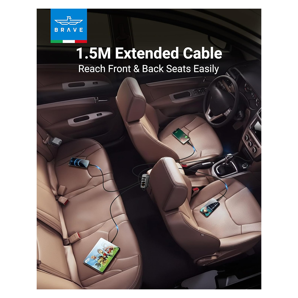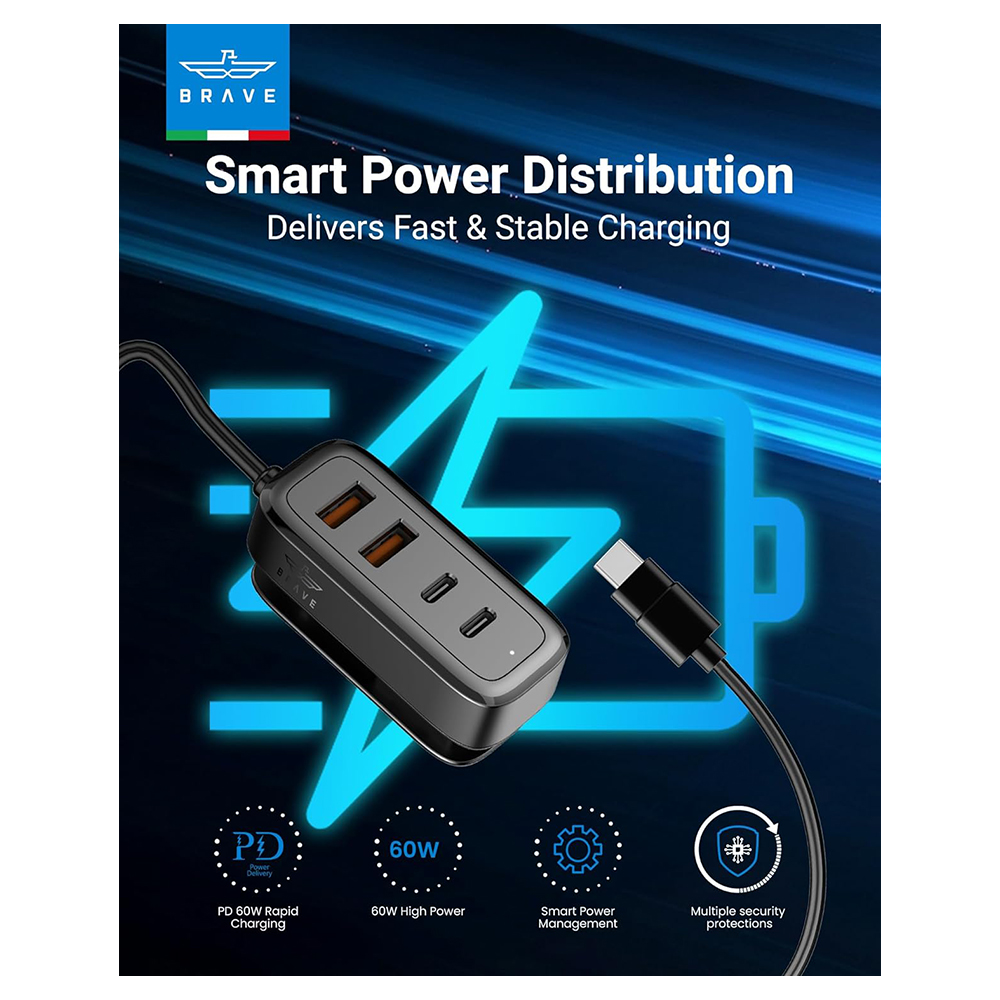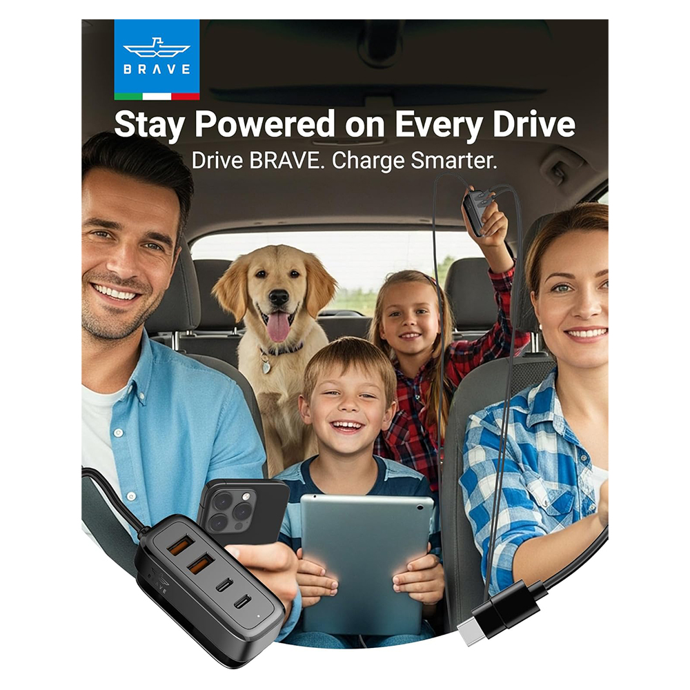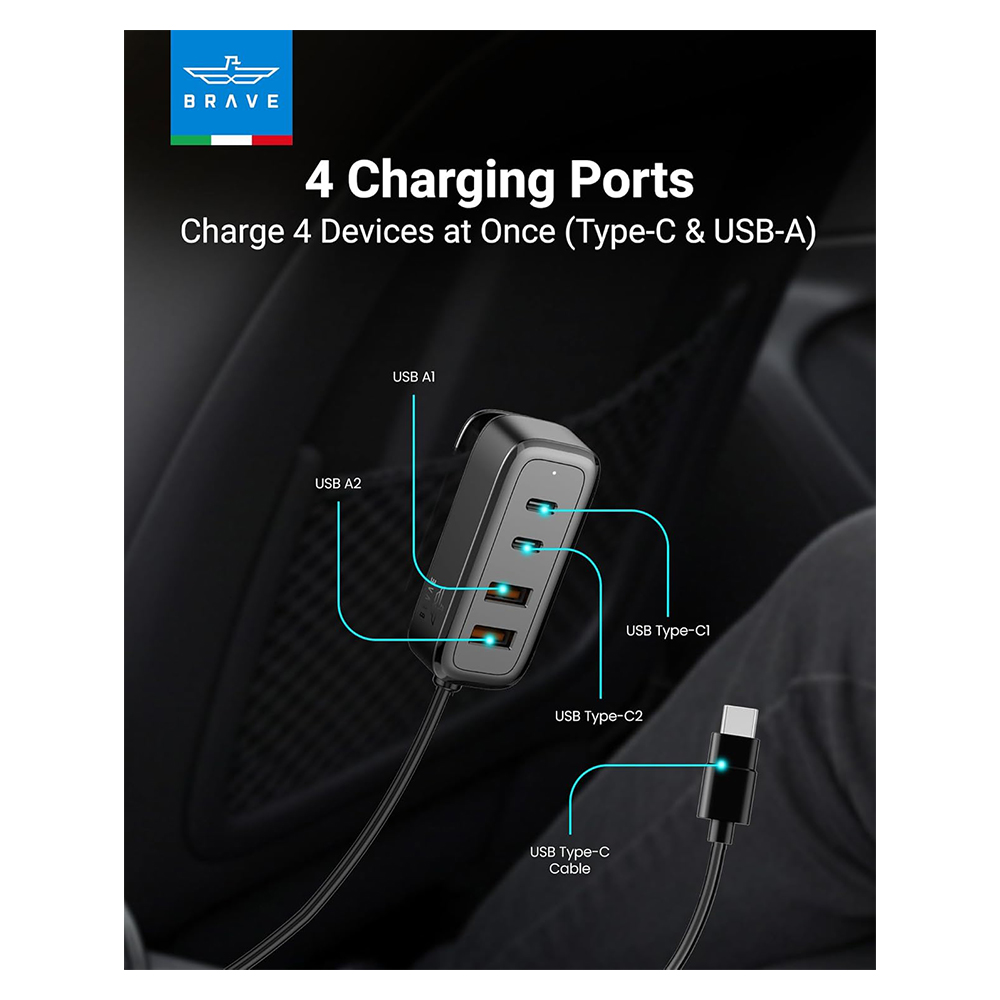 Brave 60W Universal Car Charger Fast Charging USB-C – Power Hub & Multi-Charger with 2 USB-C & 2 USB-A Ports, Smart Power Distribution, 1.5m Type-C Cable, Multi-Device Charger For iPhone 17 (BCC-29)