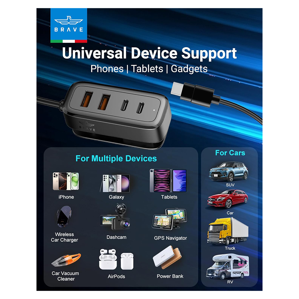 The ultimate in-car charging station for the entire family. The Brave 60W 4-Port Power Hub turns your vehicle into a mobile charging powerhouse.