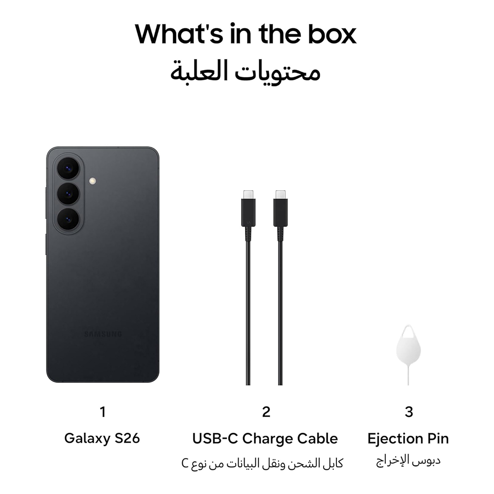 Smartphone | Data Cable | Ejection Pin Galaxy S26 does not include travel adapter.