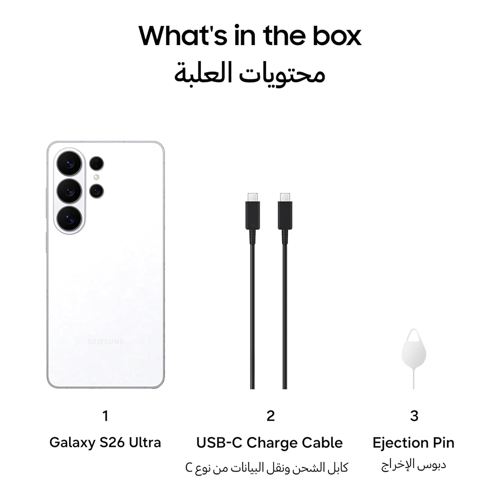 Smartphone | Data Cable | Ejection Pin  Galaxy S26 Ultra does not include travel adapter.