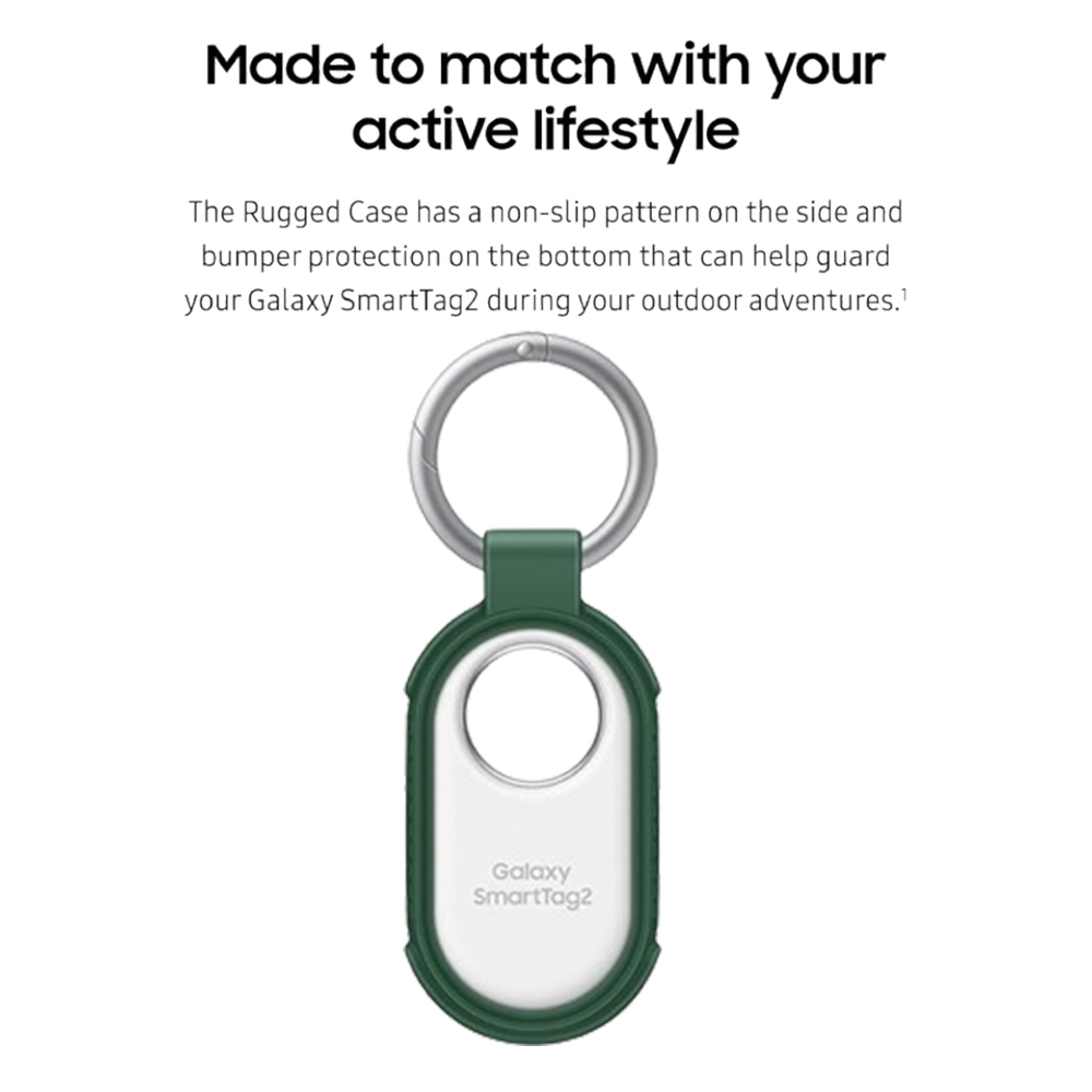 The Rugged Case has a non-slip pattern on the side and bumper protection on the bottom that can help guard your Galaxy SmartTag2 during your outdoor adventures. Fasten Galaxy SmartTag2 to your keys, bags and other valuables with a quick snap of the carabiner ring to ensure a confident journey ahead. Galaxy SmartTag2 sold separately.