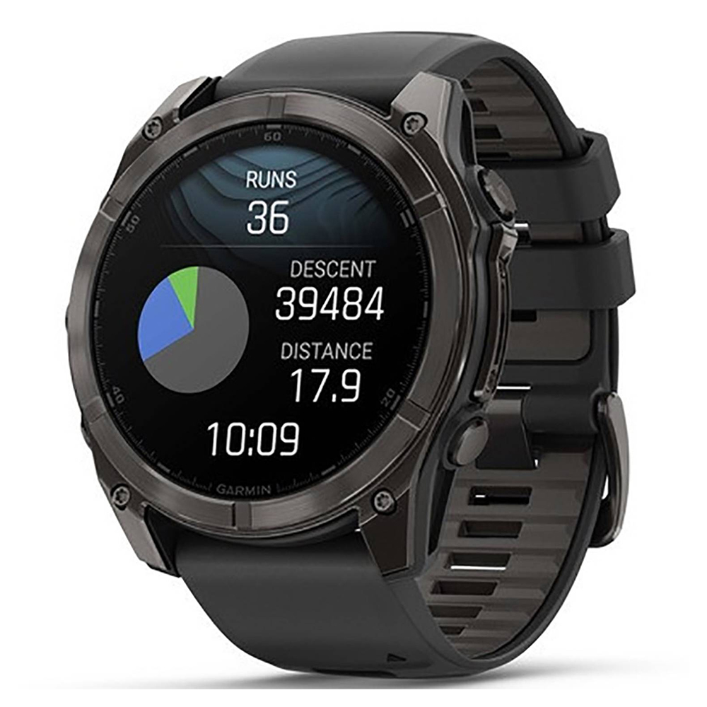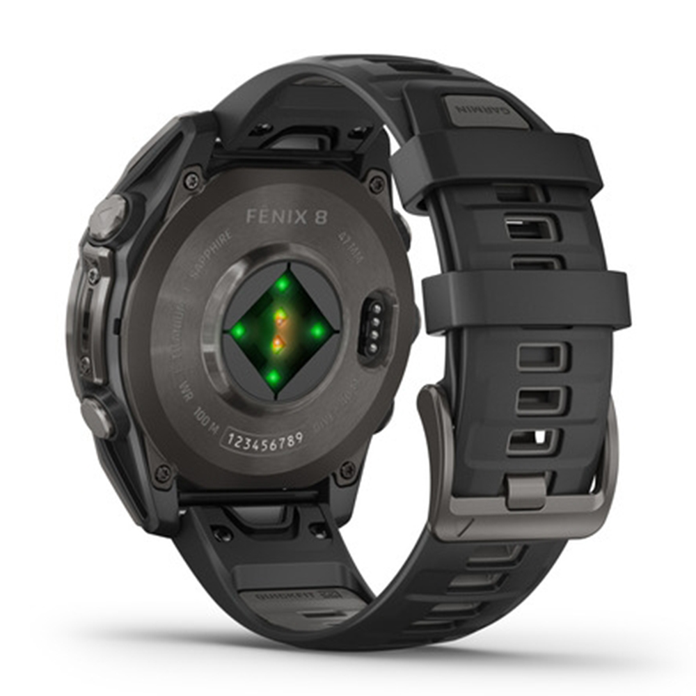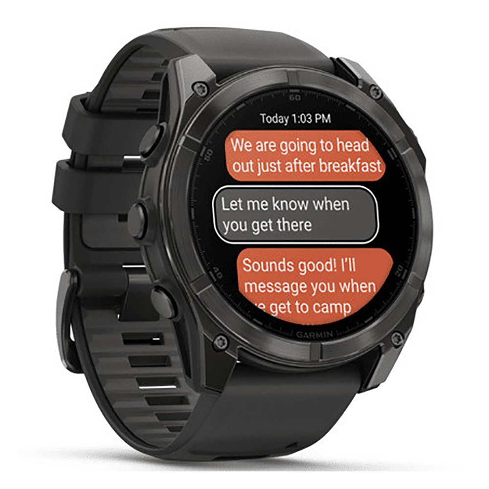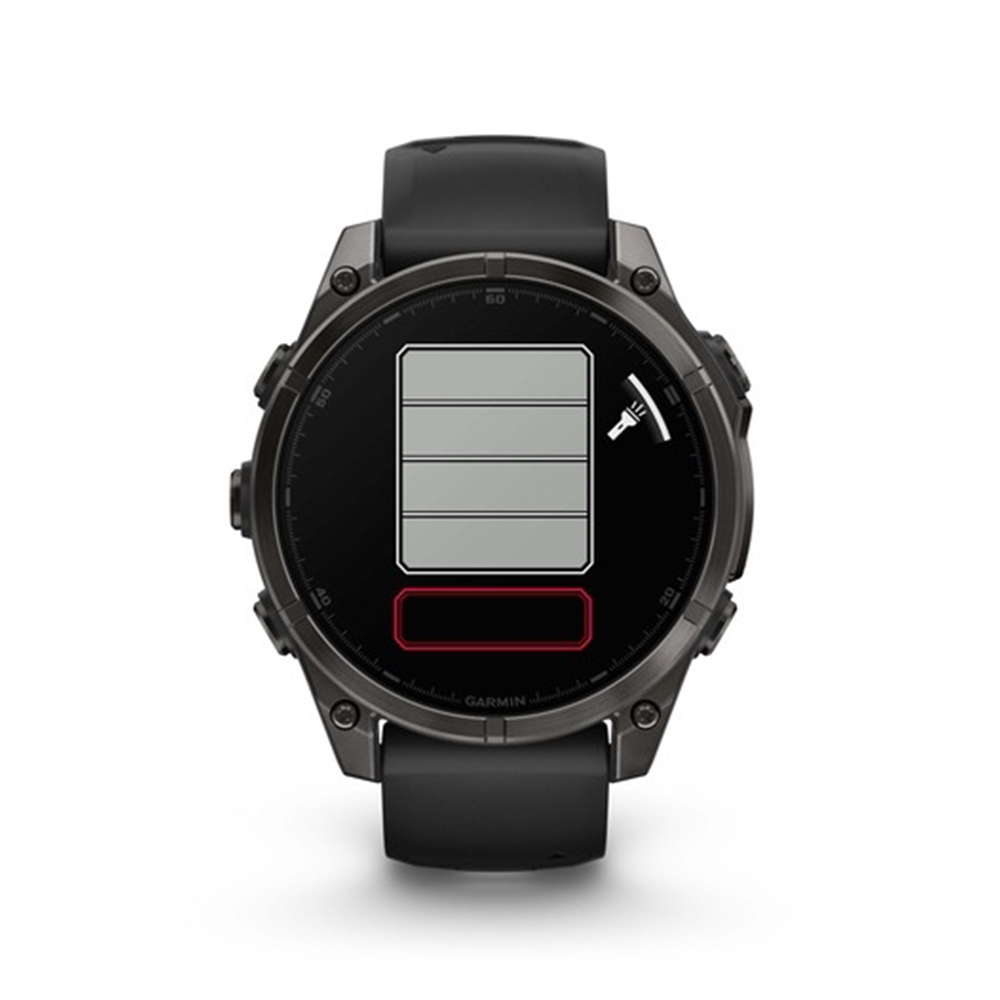 Be limitless. The fēnix® 8 multisport GPS smartwatch is built for serious athletes and outdoor adventurers who want to push beyond their limits. It features a 1.4” solar charged display with scratch-resistant sapphire lens, durable titanium bezel and powerful built-in LED flashlight for after-dark visibility. A built-in speaker and mic enable you to make and take calls from your wrist when your watch is paired to your smartphone. Power up your body’s performance, endurance and resistance to injury with targeted strength training plans and a full range of sport-specific workouts. Performance insights help manage your exertion and build stamina, while training readiness features show how much recovery time you need between workouts, based on 24/7 health and wellness monitoring of heart rate, respiration, stress, sleep and more (data presented is intended to be a close estimation of metrics tracked). Take to the trails with built-in ABC sensors and preloaded TopoActive maps. The dynamic round-trip routing feature helps simplify the planning of your runs or rides — letting you set your target distance and receive turn-by-turn directions that adjust to get you back to your start on schedule. Enjoy extended off-grid adventures with solar power providing up to 149 hours of battery life in GPS mode (assumes continuous use for entire period in 50,000 lux conditions). Plus, a 40-meter dive rating and leakproof metal buttons let you reach new depths of adventure. Additional features include music storage, Garmin Pay™ contactless payments (with a supported country and payment network), smart notifications (compatible smartphone required) and more