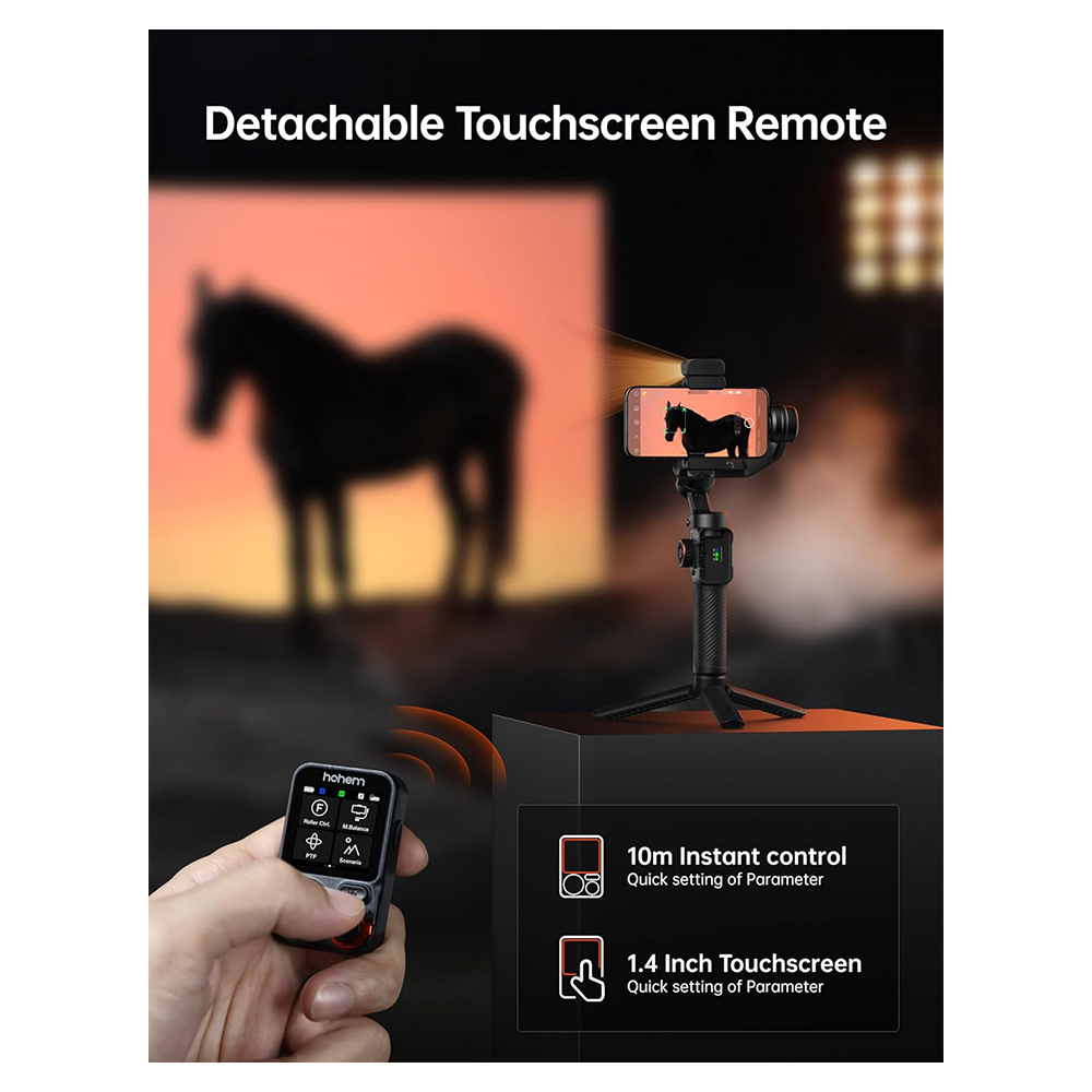 • Detachable Touchscreen Remote Controller: The Hohem M7’s new remote control features a detachable and touchscreen integrated design. The upgraded larger 1.4-inch screen is easier to view and operate. Not only can you see what you are shooting with the remote control, but you can also adjust the parameters you want when shooting conveniently.