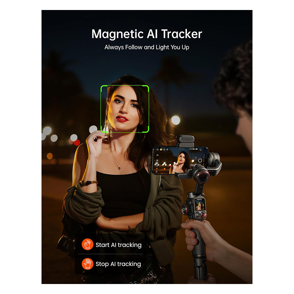 • AI Tracking without App and System Restrict๏ผšThe Magnetic AI tracker of the Hohem M7 smartphone gimbal is upgraded to 2M pixel, it will be faster and more precise to lock the object. As a hardware module not reliable for any app and system, use your gesture control or double-click on the touchscreen remote to track people, animals, or any object in a second!