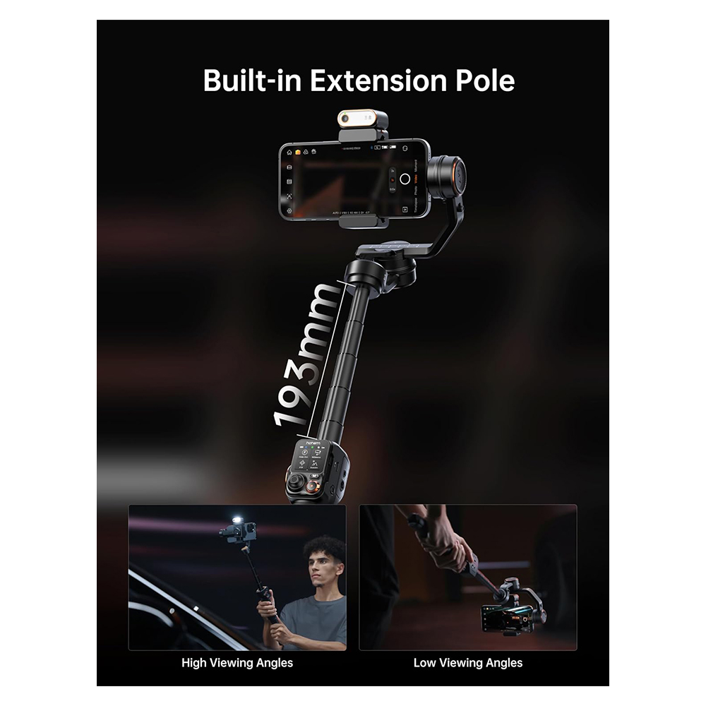 • Built-in 193mm Extension Pole: The Hohem iSteady M7 gimbal stabilizer for smartphones adds a 193mm built-in extension rod, which can simulate the drone’s shooting view at a high angle, and shoot the horizon image at a low angle, shooting a blockbuster with the built-in extension pole!