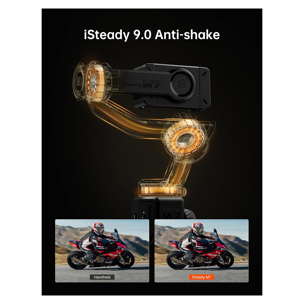 • New Advanced Stabilization Technology: Newly upgraded iSteady 9.0 3-axis stabilization can capture images clearer and smoother with less shaking and blurring. Each of the three axes has a fast lock that you can manually and quickly lock the motors according to shooting modes and scenarios, further reducing the gimbal’s shaking.