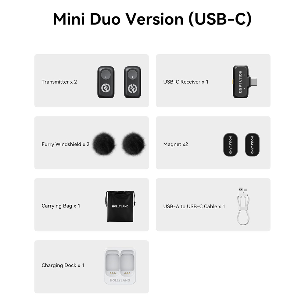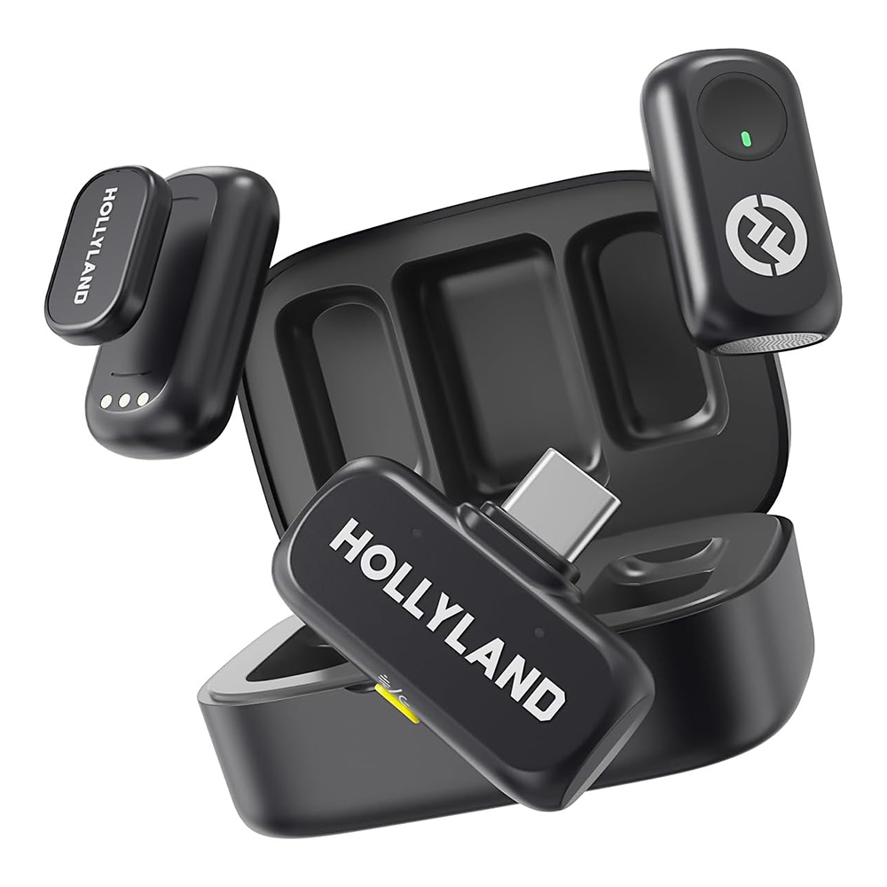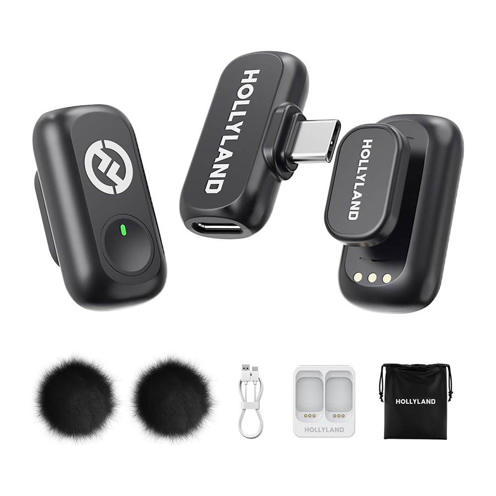 Theย Hollyland LARK A1 Mini Duoย with USB-C Receiverย is a dual-channel, digital wireless microphone system engineered for effortless smartphone connectivity and plug-and-play operationโ€”ideal for streaming, vlogging, podcasting, and video production with two people speaking at the same time. The system includes two ultracompact, clip-on transmitters with built-in omnidirectional microphones for discreet, high-quality recording, a USB-C plug-in receiver for direct use with iOS and Android devices, two furry windscreens for outdoor shoots, and a convenient charging dock for the transmitters.
