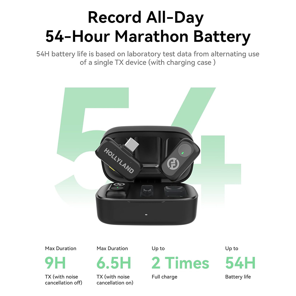 • Up to 54h Battery Life Achieve up to 54h using one transmitter (TX) alternately with the charging caseโ€”ideal for long shooting days without battery anxiety.