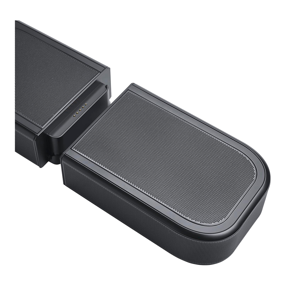 Elevate your 3D surround sound experience with dynamic, immersive height. Four up-firing speakers in the soundbar and wireless rear speakers deliver true Dolby Atmos sound. No extra wires. No power connections. Just lift the detachable surround speakers off the soundbar—you can do it with just one hand—and place them behind where you want to sit, instantly transforming them into a true surround sound setup. It’s that simple. Whether you’re binge-watching your new favorite show or hosting a movie night, the speakers’ rechargeable long-lasting batteries mean you’ll enjoy immersive, cinematic surround sound for hours. When you’re done, simply place them back on the soundbar to charge overnight.