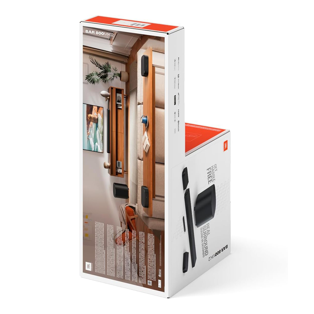 You can now get real, immersive, movie theater-quality, surround sound in just seconds. Seriously. Just pick up the two detachable wireless speakers from either end of the JBL BAR 800MK2—you can do it with one hand—and place them behind you for thrilling surround sound with 3D Dolby Atmos spatial effects, punchy bass from a 10” subwoofer, and MultiBeam 3.0 for a wider, cinematic soundstage And if you need to step out of the room while you’re catching up with your favorite video podcast or enjoying your go-to streaming playlist on your TV, just take one of the wireless speakers along and you won’t miss a thing. Your TV can’t deliver sound even close to this level. JBL has a century of experience creating top-quality speakers for cinemas, recording studios, and concert venues. And now we bring that level of craft to your living room, with a cinematic sound experience that works seamlessly with all TVs. Give yourself the freedom to experience uncompromising sound