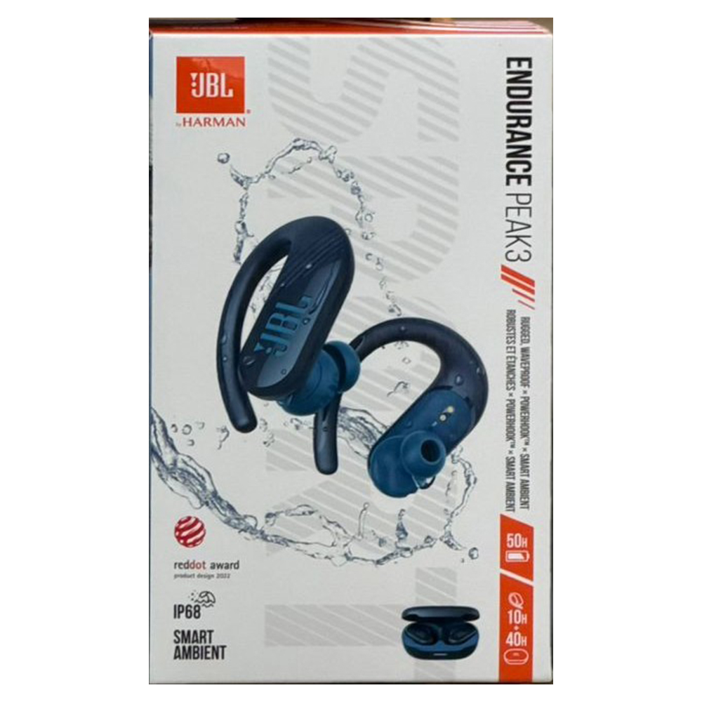 BUILT TO ENDURE YOUR PERSONAL BESTS YOUR LIFESTYLE IS ACTIVE YOU NEED WIRELESS EARBUDS THAT CAN KEEP UP. THE ENDURANCE PEAK 3 IS THE PERFECT TRAINING PARTNER, PUMPING YOUR MOTIVATIONAL PLAYLISTS TO YOU WITH UP TO 50 HOURS OF PLAYBACK AND RICH JBL PURE BASS SOUND YOU CAN FEEL IN YOUR MUSCLES. THE DURABLE IP68 DUST AND WATER PROOF DESIGN CAN HANDLE THE DUSTIEST MOUNTAIN TRAIL AND THE SWEATIEST GYM SESSION, WHILE THE BENDABLE POWER HOOK TOGETHER WITH THE TWIST LOCK EAR HOOK ENHANCER ENSURES A SECURE, COMFORTABLE FIT THAT STAYS IN NO MATTER HOW YOU MOVE YOUR BODY. AND WITH THE ABILITY TO MAKE CRYSTAL CLEAR CALLS FROM ANYWHERE AND STAY AWARE OF YOUR SURROUNDINGS, YOU’LL STAY CONNECTED TO THE WORLD NO MATTER WHERE YOUR WORKOUT TAKES YOU. TECHNICAL SPECIFICATIONS DRIVER SIZE: 10 MM/ 0.39″ DYNAMIC DRIVER POWER SUPPLY: 5 V 1 A EARBUD: 12.5 G PER PC 25 G COMBINED/ 0.0275 LBS PER PC 0.055 LBS COMBINED CHARGING CASE: 76 G/ 0.167 LBS EARBUD DIMENSIONS HEIGHT WIDTH DEPTH: MM/IN 51.9240.6529.34/2.041.601.16 CHARGING CASE DIMENSIONS HEIGHT WIDTH DEPTH: MM/IN 90.9357.9435.57/3.582.281.40 EARBUD BATTERY TYPE: LITHIUM ION POLYMER 70 MAH/ 3.85 V CHARGING CASE BATTERY TYPE: LITHIUM ION POLYMER 950 MAH/ 3.7 V CHARGING TIME: 2 HRS FROM EMPTY TALK TIME: 5.5 HRS MUSIC PLAYTIME WITH BT ON: UP TO 10 HRS FREQUENCY RESPONSE: 20 HZ 20 KHZ IMPEDANCE: 16 OHM SENSITIVITY: 102 DB SPL@1 KHZ MAXIMUM SPL: 93 DB MICROPHONE SENSITIVITY: 38 DBV/PA@1 KHZ BLUETOOTH VERSION: 5.2 BLUETOOTH PROFILE VERSION: A2DP V1.3, AVRCP V1.6, HFP V1.7 BLUETOOTH TRANSMITTER FREQUENCY RANGE: 2.400 GHZ 2.4835 GHZ BLUETOOTH TRANSMITTER POWER: <14 DBM BLUETOOTH TRANSMITTER MODULATION: GFSK, Π/4 QPSK, 8DPSK MAXIMUM OPERATION TEMPERATURE: 45 DEGREE C” IP RATING: IP68 JBL BY HARMAN FOR OVER 75 YEARS, JBL HAS ENGINEERED THE MOST PRECISE, IMPRESSIVE SOUND FOUND IN BIG VENUES AROUND THE WORLD. HARMAN’S MISSION AND VISION IS TO MAKE LIFE MORE CONNECTED, ENTERTAINING, PERSONALIZED AND PRODUCTIVE. THE COMPANY COMBINES PASSION AND PURPOSE TO DESIGN SMART PRODUCTS SYSTEMS, SOFTWARE AND SERVICES TO CONNECT PEOPLE WHEREVER THEY ARE
