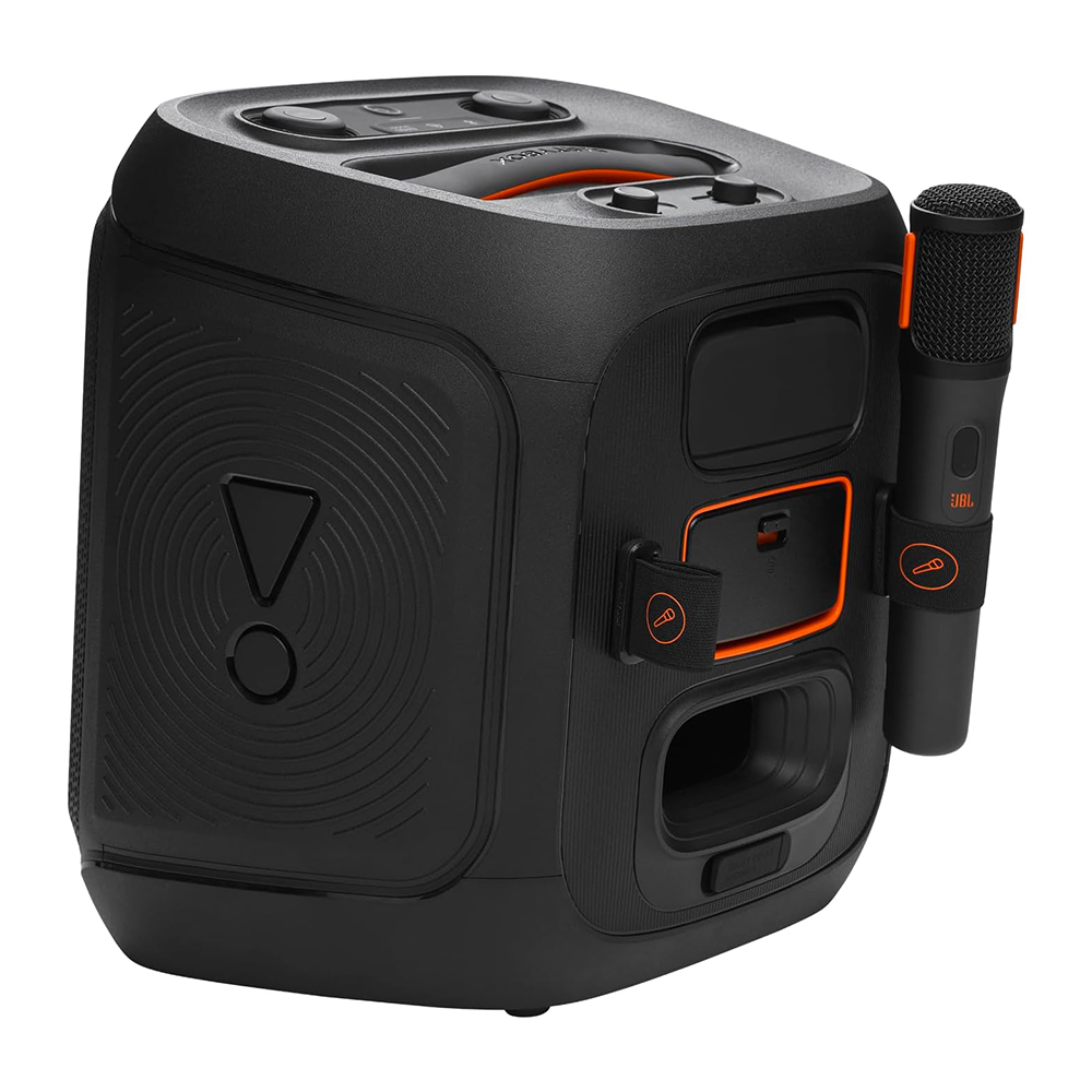 Features and Benefits JBL Pro Sound gets an AI Sound Boost Pop ballads, slow jams and everything in between, we’ve got the sound to make your playlist shine. Feel that extra oomph in your chest as the silk dome tweeters and powerful woofers bring those epic highs and deep lows. Want to turn it up even louder? Your music will still sound crystal clear as the AI Sound Boost delivers more powerful sound with less distortion. Dynamic lightshow Is it really a party without a lightshow? Dance the night away with glowing light patterns and strobe effects that would make any club jealous. Up to 15 Hours of play time Keep the good vibes going on a single charge with up to 15 hours playtime. And if 12 hours of nonstop jams isn’t enough, pop in a spare rechargeable battery to keep the music going. Or charge for 10 minutes and get an extra 80 minutes of play time. *Spare replaceable battery sold separately. Multi-speaker connection by Auracast™ Bigger parties call for even bigger sound. Pair two PartyBox Encore 2 for true stereo vibes via Auracast™, or connect multiple JBL Auracast™- enabled speakers wirelessly and let your music grow with your party size. Karaoke anywhere—or play live Grab the digital wireless mic and become your own emcee. With adjustable echo, bass, and treble controls, you’ll always sound smooth. Or dance to your favorite playlists with aux-in and USB-C connectors. Looking to put on a live set? The guitar input comes with pre-gain and a volume knob so you can crank it up and perform. Control your party, right from the JBL PartyBox App Don’t feel stuck on speaker babysitting duty. Control your music, EQ settings, and lightshow from the JBL PartyBox app, wherever the party takes you. IPX4 Splash proof Spills and splashes happen…don’t sweat the mess. The JBL PartyBox Encore 2 is IPX4 splash proof so your flow is never interrupted. Flexible handle and ergonomic design Take your sound down the block or go global–whichever you choose the JBL PartyBox Encore 2 is ready to go with its flexible handle and ergonomic design. Recycled plastic and fabric, plus FSC certified paper packaging The JBL PartyBox Encore 2 incorporates post-consumer recycled plastic. It’s also packaged in FSC-certified paper printed with soy ink. Bring the star power to your next party. Power up the JBL PartyBox Encore 2 and let the good times roll. With this portable speaker, you’ll want to play DJ at every event, with smooth JBL Pro Sound, a light show to fit the mood, and a mic for your emceeing pleasure. Feel that extra oomph in your chest from the epic highs and deep lows, whether your playing a new pop ballad or going with a classic slow jam. Once you’ve nailed the soundcheck, it’s time to turn up the ambiance with a light show that grooves to your beats. Ready to run the show? Grab the digital wireless mic and become your own emcee or karaoke host! You can also customize your sound with adjustable echo, bass, and treble controls to make sure you sound just right. From open rooftops to crowded basements, the JBL PartyBox Encore 2 knows how to adapt, with its grab-and-go handle and IPX4 splash-proof design. What’s better than one JBL PartyBox Encore 2? Two! Pair them up for true stereo vibes or link with other JBL Auracast™-enabled speakers for an even wilder dance party. And if 15 hours of nonstop jams isn’t enough, grab a spare rechargeable battery to keep the music going. Make the vibes immaculate with the JBL PartyBox app, where you can control your playlist, add fun sound effects, and pick the perfect light show mood—all while you’re doing the worm on the dance floor. Whatever the occasion, the JBL PartyBox Encore 2 knows how to bring all the feels. What’s in the Box 1 x JBL PartyBox Encore 2 speaker 1 x wireless microphone 1 x mic holder 1 x Quick-start guide 1 x Safety Instruction and Warranty Card AC power cord – quantity and plug type vary by regions.