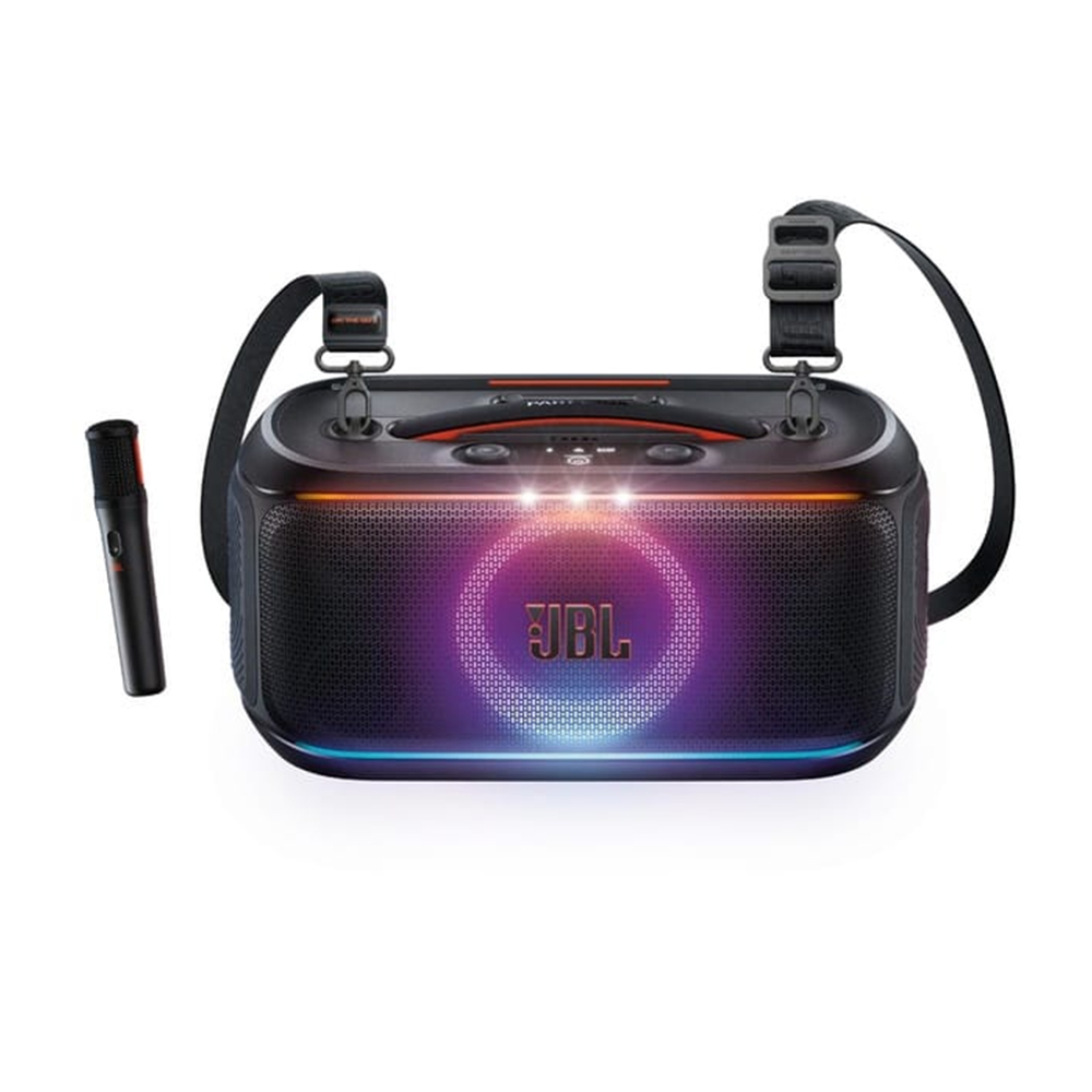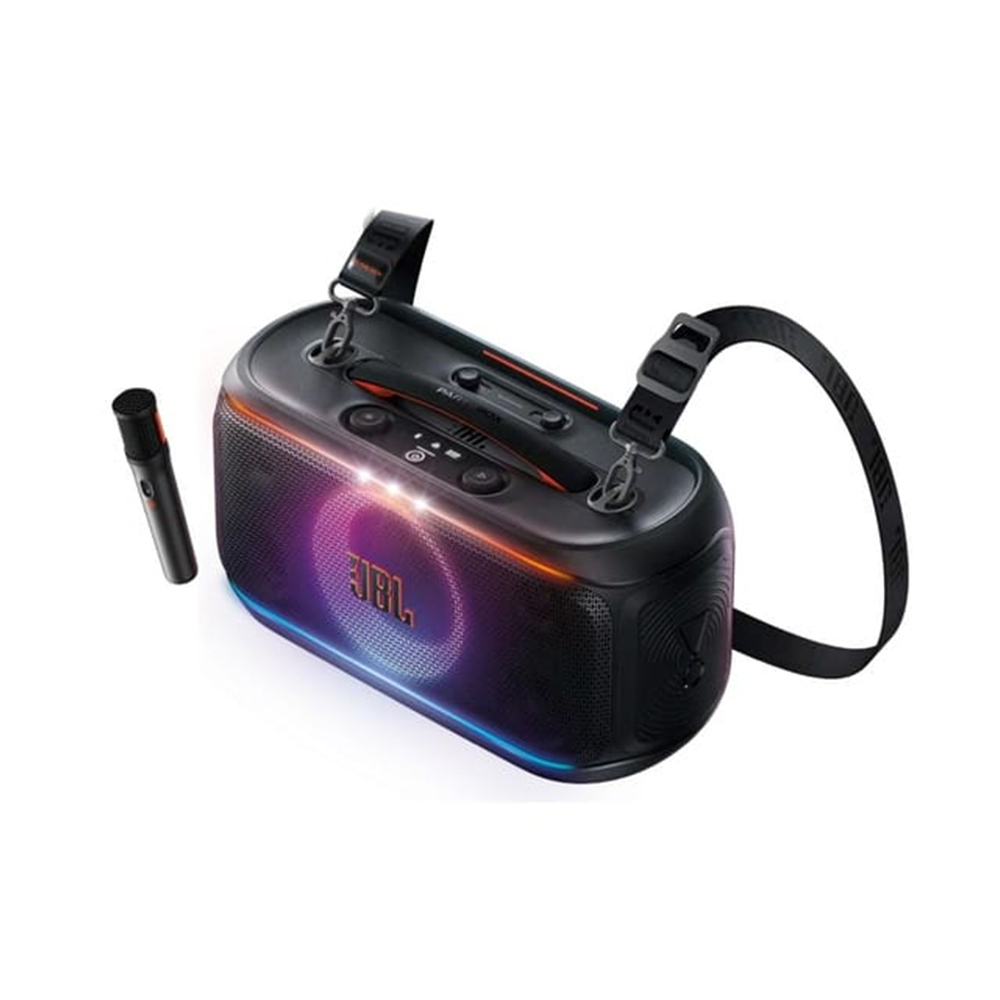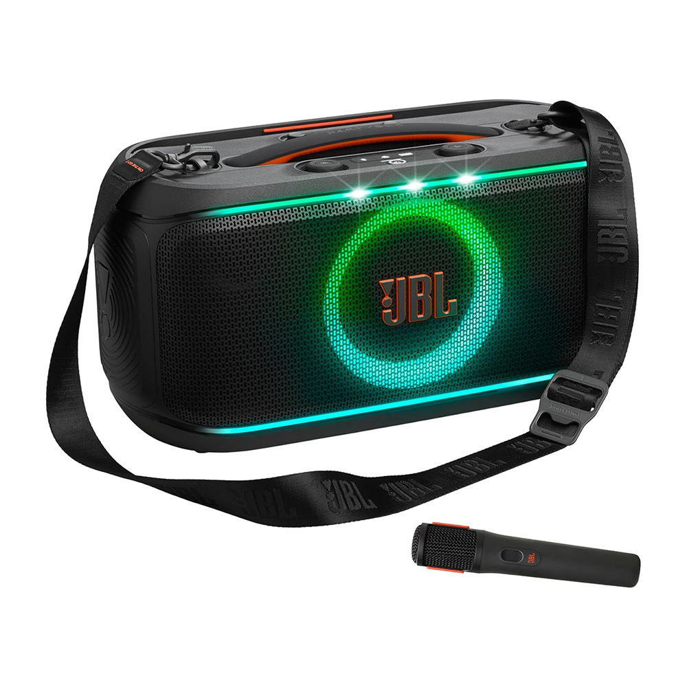 The PartyBox On-The-Go 2 brings the heat with powerful JBL Pro Sound—crisp highs, loud bass, the whole vibe. The lightshow moves with our music, and the wireless digital mic (with built-in echo!) makes everyone sound like a star. With a shoulder strap, up to 15 hours of playtime, and splashproof design, we’re ready to take the party anywhere.