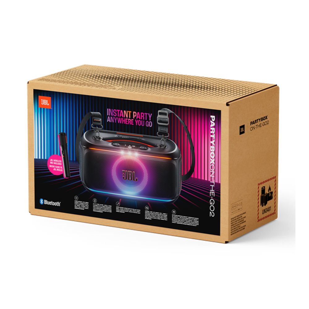 Turn every hangout into a celebration with the JBL PartyBox On-The-Go 2. Packed with powerful JBL Pro Sound, a dynamic lightshow, and a wireless digital mic, this portable speaker lets you sing, dance, and vibe wherever you go. With up to 15 hours of playtime, a convenient handle and shoulder strap, and splashproof design, it’s ready for any party, indoors or outdoors. Pair two speakers for stereo sound or connect multiple JBL Auracast™-enabled speakers for an unforgettable sound experience. Control your music and lights effortlessly with the JBL PartyBox app, and celebrate sustainably with eco-friendly packaging. Perfect for pool parties, family gatherings, karaoke nights, or chill hangouts, the PartyBox On-The-Go 2 is your ultimate portable party companion.