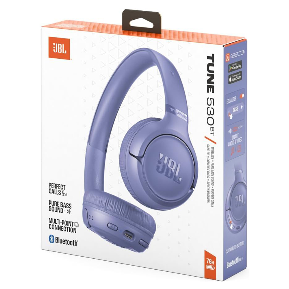 Bring your world to life with the sound, style, and freedom of JBL Tune 530BT wireless headphones. Bold, immersive JBL Pure Bass Sound brings energy to every playlist, podcast, or callโwhether youโre powering through your day or winding down at night. With up to 76 hours of battery life, you can listen longer without slowing down. And when youโre running low, a quick 5-minute charge gives you up to 5 more hours of music. Thanks to 2 mics that accurately pick-up your voice, enjoy clear voice calls in any environment, while seamless Bluetoothยฎ connectivity lets you switch effortlessly between devices, so youโre always connected to what matters. Personalize your sound with the JBL Headphones app, guided by clear voice prompts that make setup simple. Lightweight, all-day comfortable, and effortlessly fordable, JBL Tune 530BT headphones are built to move with you and crafted to match your style.