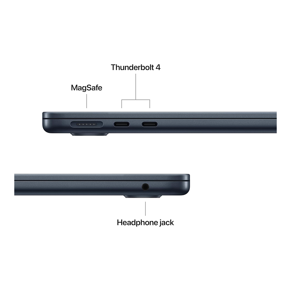 • CONNECT IT ALL—MacBook Air features two Thunderbolt 4 ports, a MagSafe charging port, a headphone jack, Wi-Fi 6E, and Bluetooth 5.3. And it supports up to two external displays.