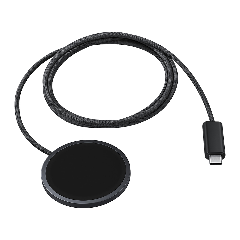 The Magnet Wireless Charger offers Qi2-certified fast charging with a slim 4.4 mm design and 1.5 m fabric cable | letting you use your device while charging | Its non-slip surface and precision magnets keep your device steady | and it also supports Galaxy Buds charging|