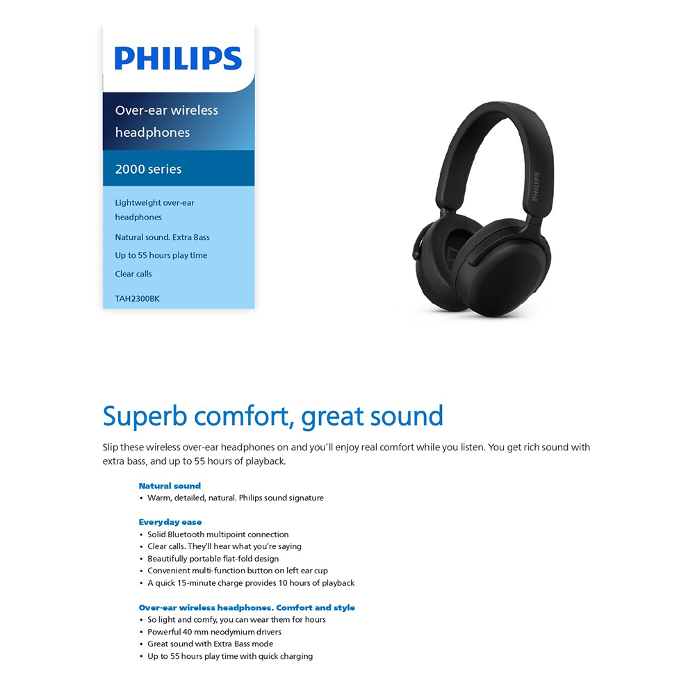 Philips 2000 Series Wireless Headphones TAH2300 | 55H Playtime | Bluetooth 5.4 Multipoint | Extra Bass | Foldable Travel Headphones | Lightweight Comfort | Noise Reduction Mic | Clear Calls|