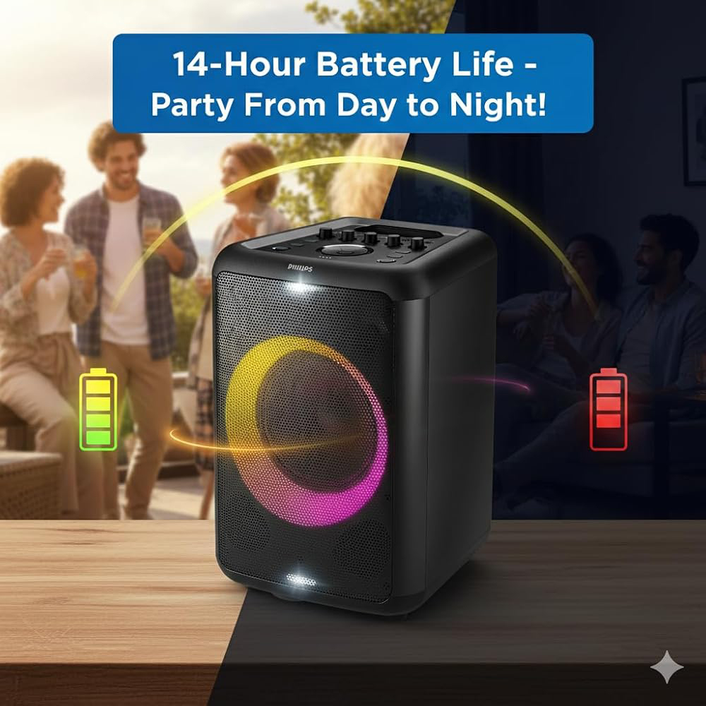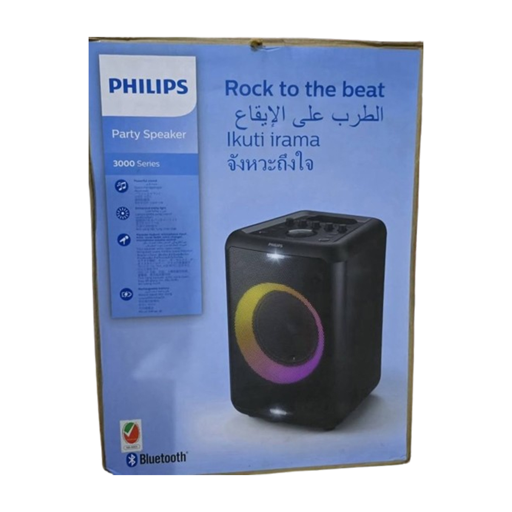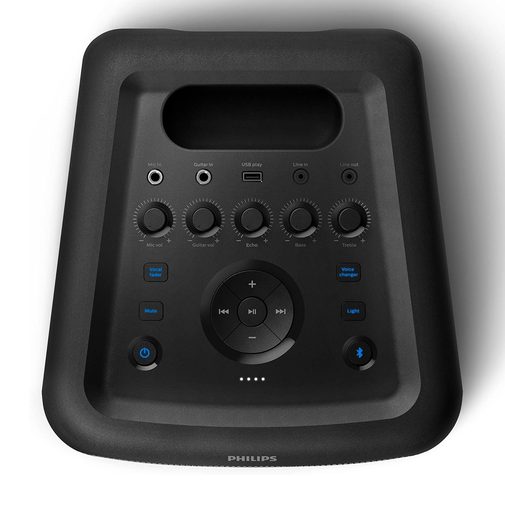 Overwhelming rhythm Organize a party anywhere with this large portable speaker. Play guitar, play your favorite songs or show off with the microphone: colorful lights and strobe mode on the speaker. The convenient handle allows you to carry the speaker with ease. Discover all the benefits If you are eligible for VAT exemption for medical devices, you can use it with this product. The VAT amount will be deducted from the above price. See full details in your cart. You will automatically receive a Philips Sonicare replacement brush head every 3 months. Once the transaction is complete, you will automatically receive a head every 3 months until you tell us you wish to suspend or cancel your subscription. Limit of 4 subscriptions per family/account. By paying the displayed fee at the time of payment every 3 months*, the new brush head will be automatically delivered to your home. For more information on applicable terms and conditions, including additional payment terms, please refer to Philips General Conditions of Sale No interest, percentage or fees are provided for installments; the total cost of the loan is $0, and you can always pay the entire outstanding balance in advance or make no penalty on any scheduled or at least monthly prepayment date. *Prices without taxes The Sonicare replacement brush heads subscription aims to guarantee you a healthy smile with utmost convenience. You can suspend or cancel your headset subscription at any time! Returns will be accepted within 30 days of receipt. In case of non-payment, an error message will be sent to your email address with a link to update your details and complete the payment. Shipments will be suspended until payment. For more information, visit {0}. Limit for 4 subscriptions Deep bass. Up to 14 hours of playtime With its powerful sound and deep bass, this speaker fills your surroundings with your music. The built-in battery allows you to move your outdoor party for up to 14 hours of playtime on a single charge. Party light effects. Let yourself be carried away by the music. Let your guests dance with great party light effects! A coloured light ring on the speakers flashes at music time and you can choose between four different lighting modes. Whatever your party idea, this speaker is for you. Microphone and guitar inputs Karaoke effects Thanks to the microphone input (6.3 mm), your parties will be a real eye-catcher. In addition, the guitar input allows you to roam in absolutely. Microphone and effect controls are available on the speaker. You can change the voice, dampen the voice track and add echo effects. All your songs. Bluetooth, audio input and more Stream your playlists via Bluetooth. Connect the speaker to other sources via audio or USB input, or connect the speaker to another speaker or amplifier via the line-out jack. With the knobs on the speaker, you can choose the source or optimally adjust bass and treble. Always ready to use Thanks to the integrated carry handle and battery, you can play your music anywhere. Bring music to a friend’s home or to a basketball court. You can skip tracks and increase the volume directly from the speaker. Audio output power (MAX) 80W output power (RMS) 40W Total harmonic distortion