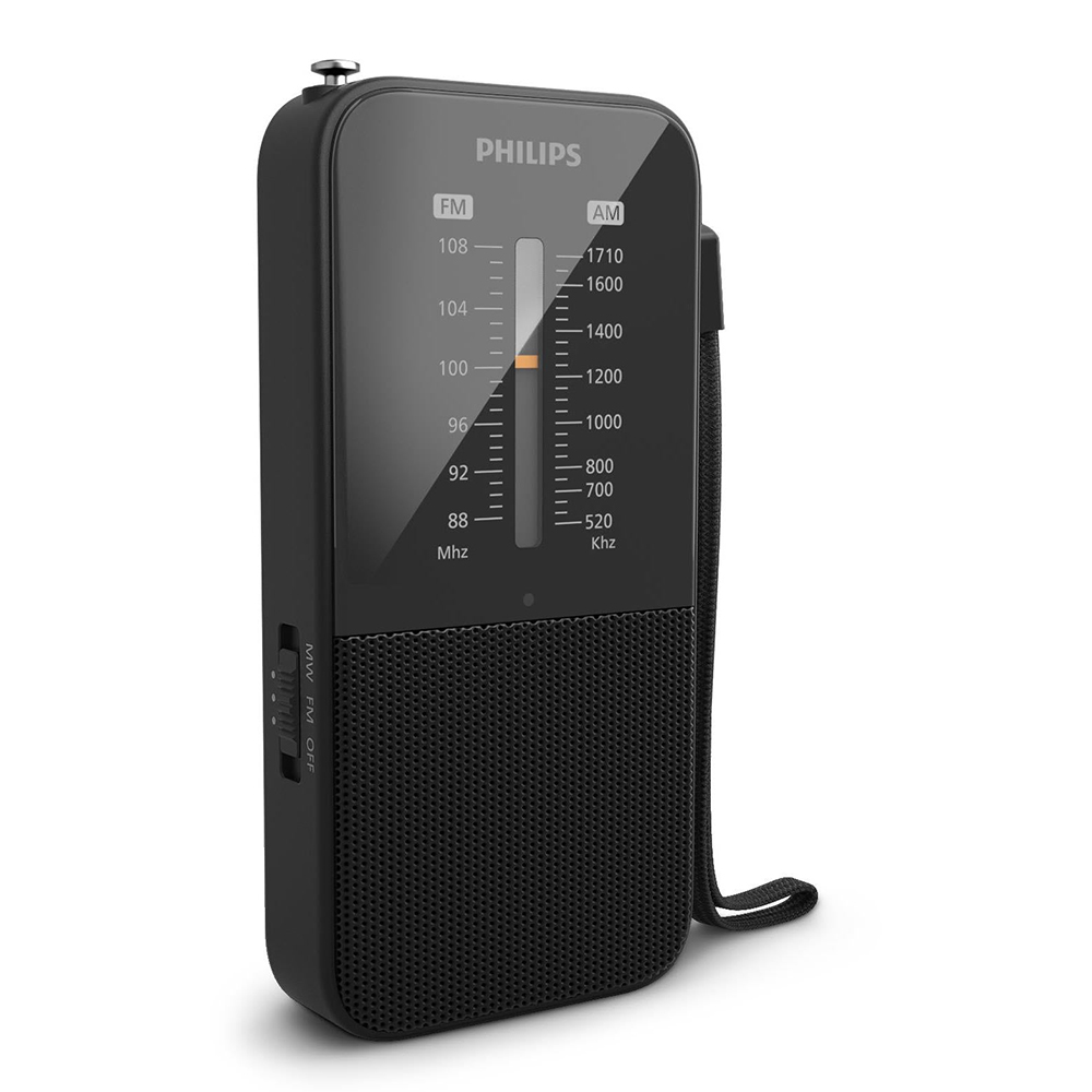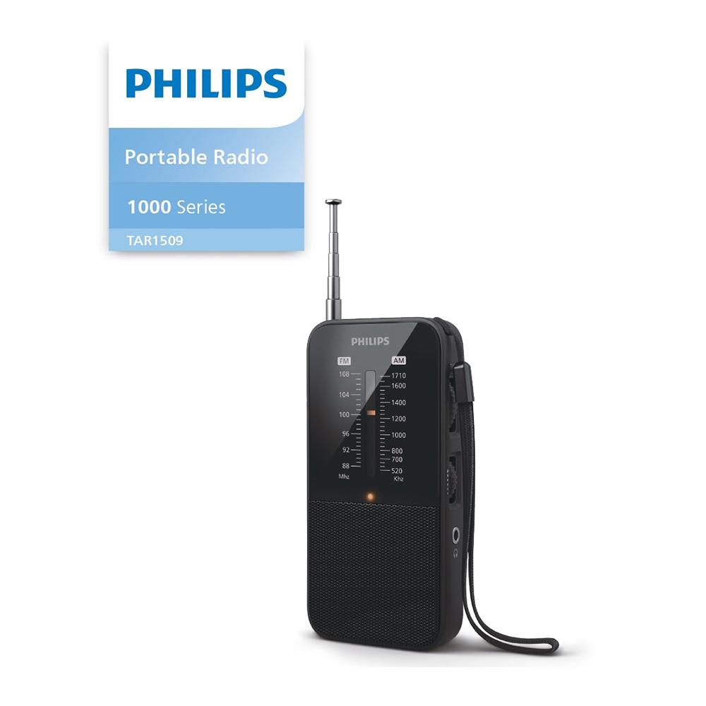 Experience the simplicity and convenience of the Philips Portable FM/MW Radio TAR1509. Designed for ultimate portability, this classic pocket-sized radio offers crisp, clear sound and excellent reception, making it perfect for enjoying your favorite music, sports, or news on the go. The analogue FM/MW tuning allows you to effortlessly find your preferred stations, while the large traditional-style tuning window and easy-to-use thumbwheels for tuning and volume control ensure a seamless user experience. Equipped with a long telescopic antenna, the Philips TAR1509 guarantees superior reception wherever you are. This compact radio is battery-operated, requiring only 2 x AAA batteries, making it an ideal companion for travel, outdoor activities, or simply relaxing at home without needing a power outlet. The included lanyard adds to its portability, allowing you to hang it around your wrist or slip it into your pocket with ease. Additionally, the radio features a convenient headphone port for private listening, ensuring you can enjoy your favorite stations without disturbing others. With its classic design, robust functionality, and user-friendly controls, the Philips Portable FM/MW Radio TAR1509 is your perfect companion for staying connected to the sounds you love, anytime and anywhere.