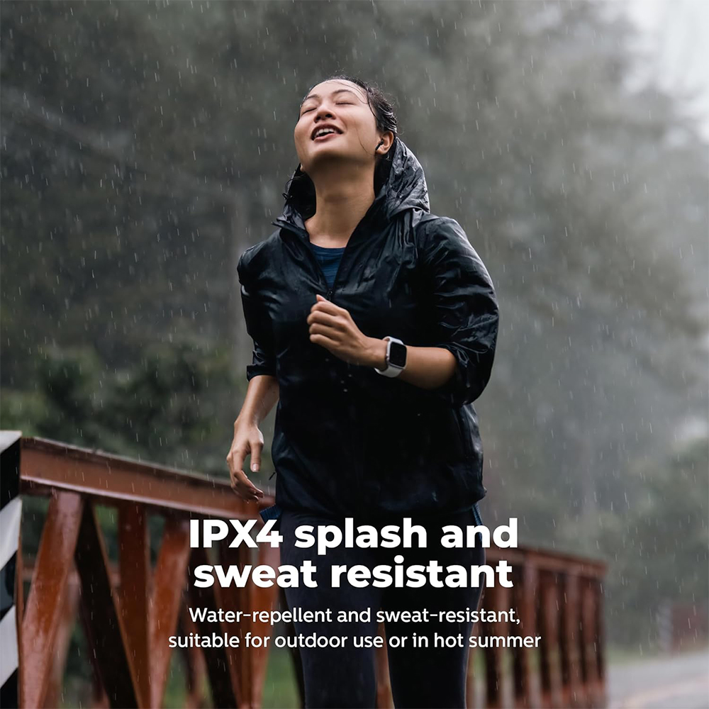 • IPX4 water resistance rating supports use during workouts and light rain while maintaining reliable performance