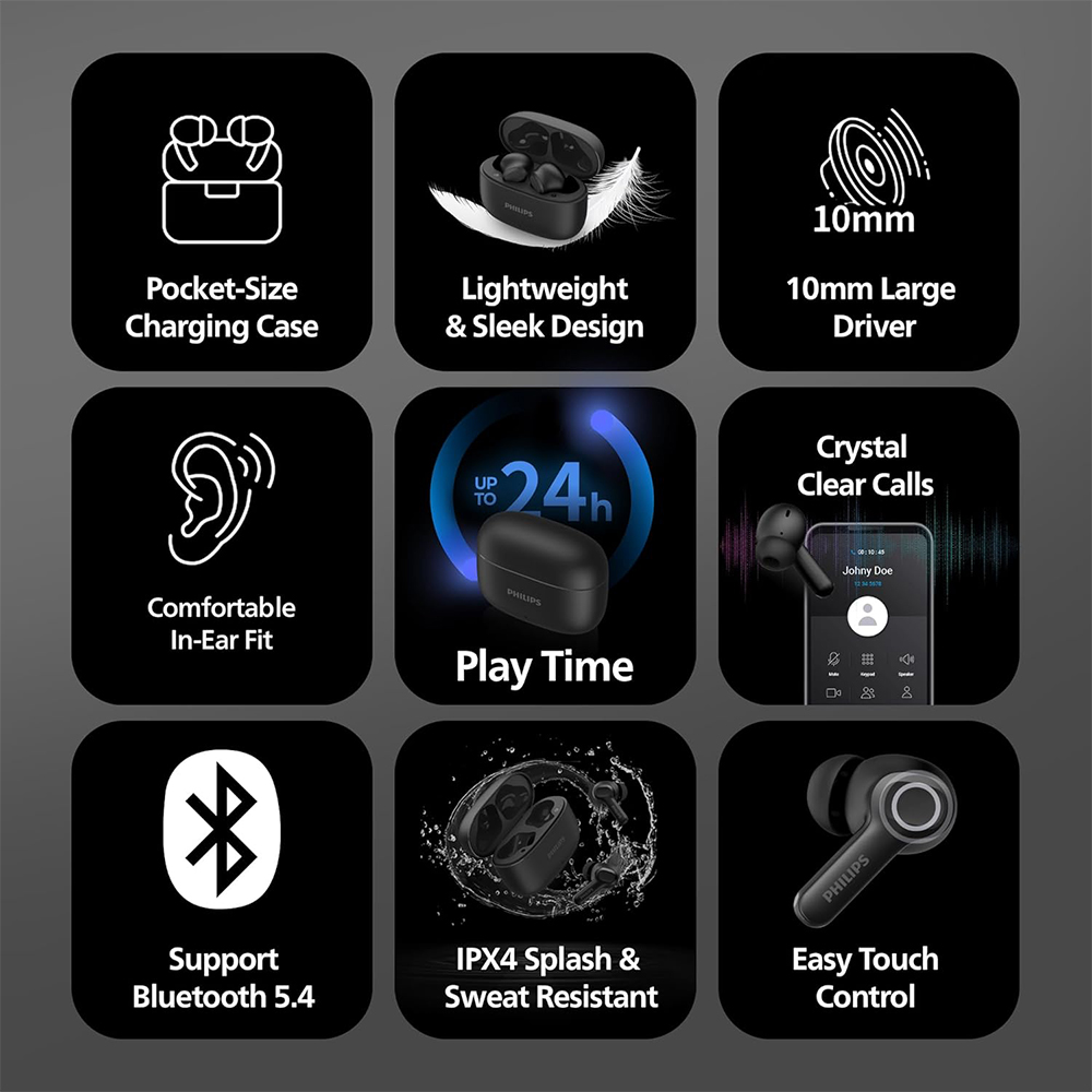Philips TAT1109 True Wireless Earbuds | Bluetooth 5.4 | 10 mm Dynamic Bass Drivers | 24 hours Battery (earbuds 6 + case 18) | IPX4 Sweat‑ & Splash‑Resistant | Touch Control | Compact Charging Case | Voice Assistant | Pocket-Size Case|