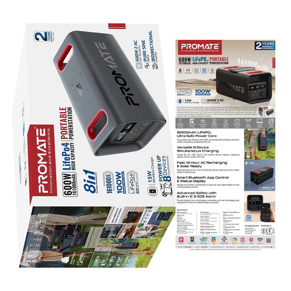 Promate Portable Power Station 600W LiFePO4 Generator with 161,000mAh Battery, Dual AC Outlets, PD100W USB-C, 15W Wireless Charger, DC Port, Solar Ready, Bluetooth Control