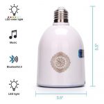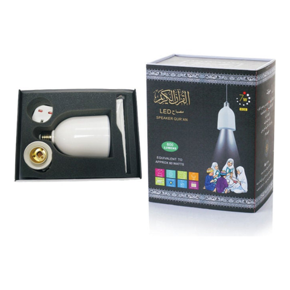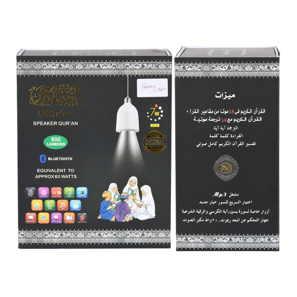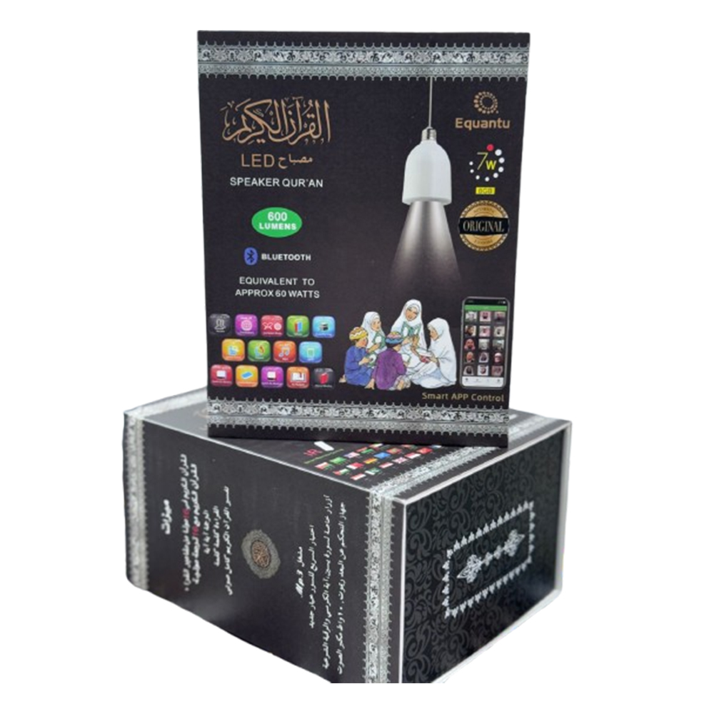Light Specifications: Input voltage: AC100-240, 50-60Hz. Power consumption: audio 10W light 7W. Power efficiency: more than 75%. Color temperature: 3000K. Audio output power: 25. Audio distortion: 0.5%. Frequency response: 80-20KHz. description: LED Loudspeaker The Qur’an Light is a product of Muslim use, with dual functions (lighting and learning).