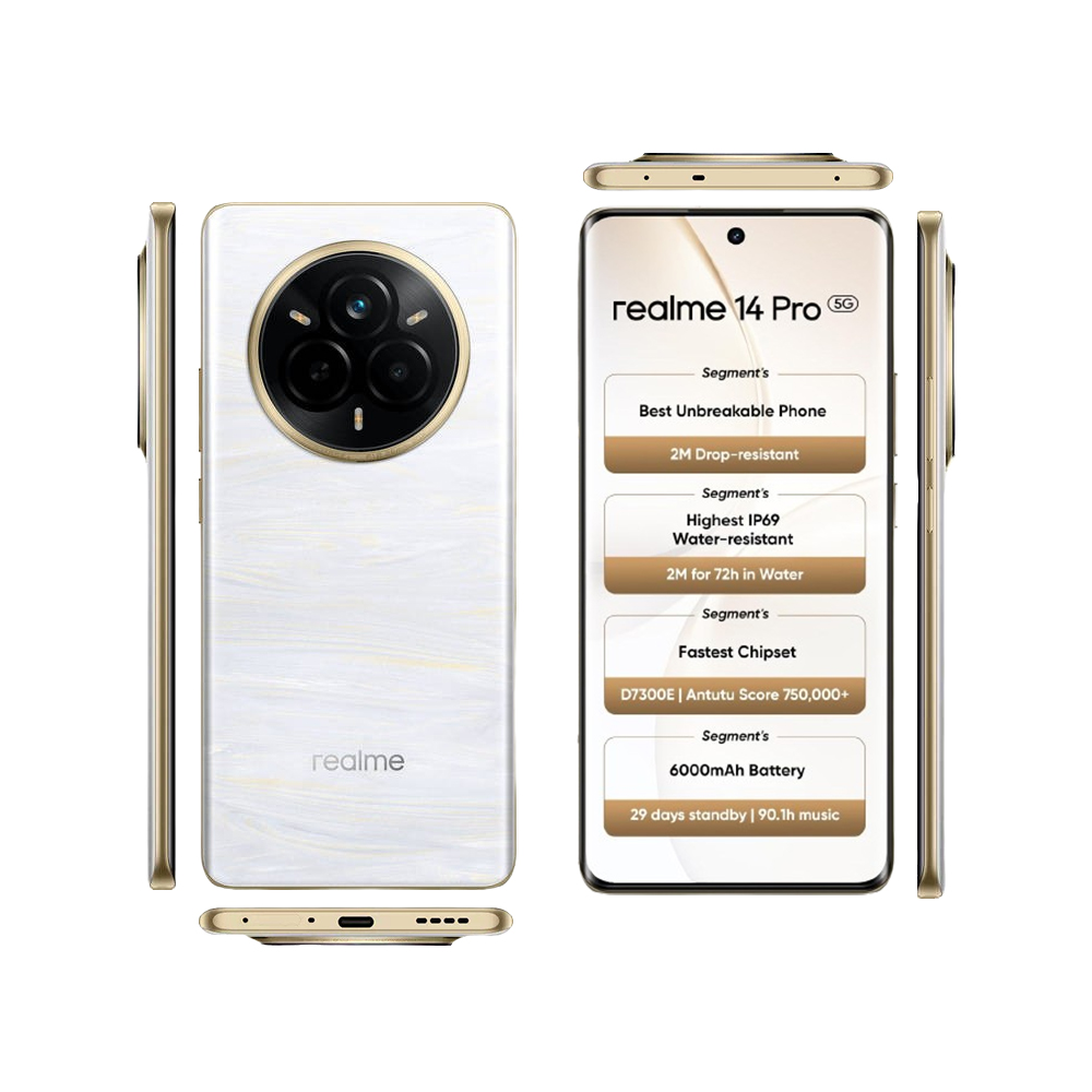Step into the future of smartphone technology with the realme 14 Pro 5Gโa flagship performer that blends rugged durability with cutting-edge design. Powered by the efficient MediaTek Dimensity 7300 Energy (4nm) processor and 12GB RAM, it offers fluid performance for multitasking, gaming, streaming, and more. With 256GB of internal storage, you have ample room for all your apps, photos, and media. Capture your world in extraordinary detail with the 50MP OIS main camera, paired with 4K video recording and AI enhancements that bring professional-level clarity to every shot. The 16MP front camera ensures you always look your best on selfies and video calls. The massive 6.77-inch OLED display boasts 120Hz refresh rate and 1B colors, delivering a smooth, vibrant visual experience with peak brightness of 4500 nitsโideal for use even in direct sunlight. Designed to withstand the elements, the realme 14 Pro comes with IP68/IP69 dust and water resistance, plus MIL-STD-810H durability. Itโs also equipped with Wi-Fi 6, Bluetooth 5.4, dual stereo speakers, and a secure under-display fingerprint sensor. With a 6000mAh battery, the realme 14 Pro ensures power is never a problem. Whether you’re a traveler, a creator, or a gamer, this device is built to keep up with your lifestyleโeffortlessly blending performance, durability, and style.