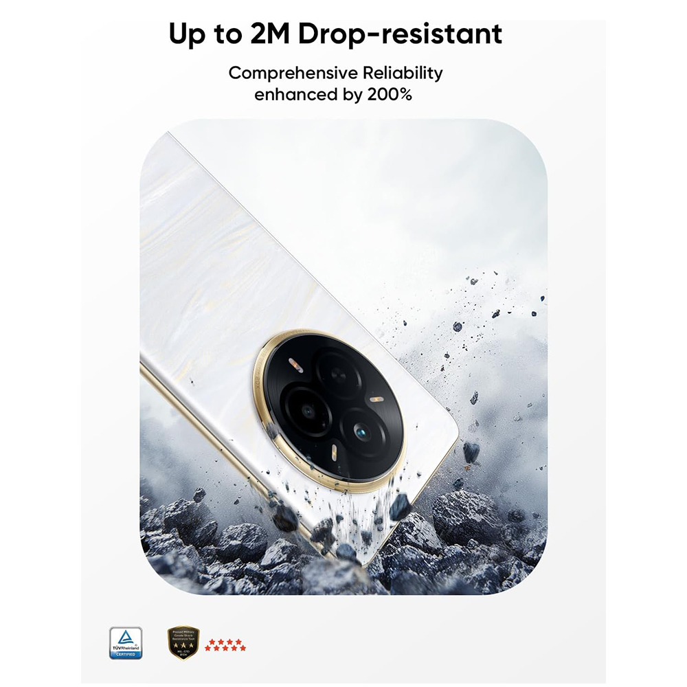 The realme 14 Pro offers enhanced strength and excellent drop protection, passing both TรV Rheinland Rugged Smartphone Certification and the Military Grade Shock-Resistance Test.