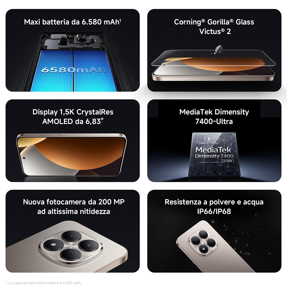 Massive 6580mAh battery Corning® Gorilla® Glass Victus® 2 IP66/IP68/IP69/IP69K dust and water resistance New 200MP ultimate-clarity camera 6.83″ 1.5K CrystalRes AMOLED display MediaTek Dimensity 7400-Ultra