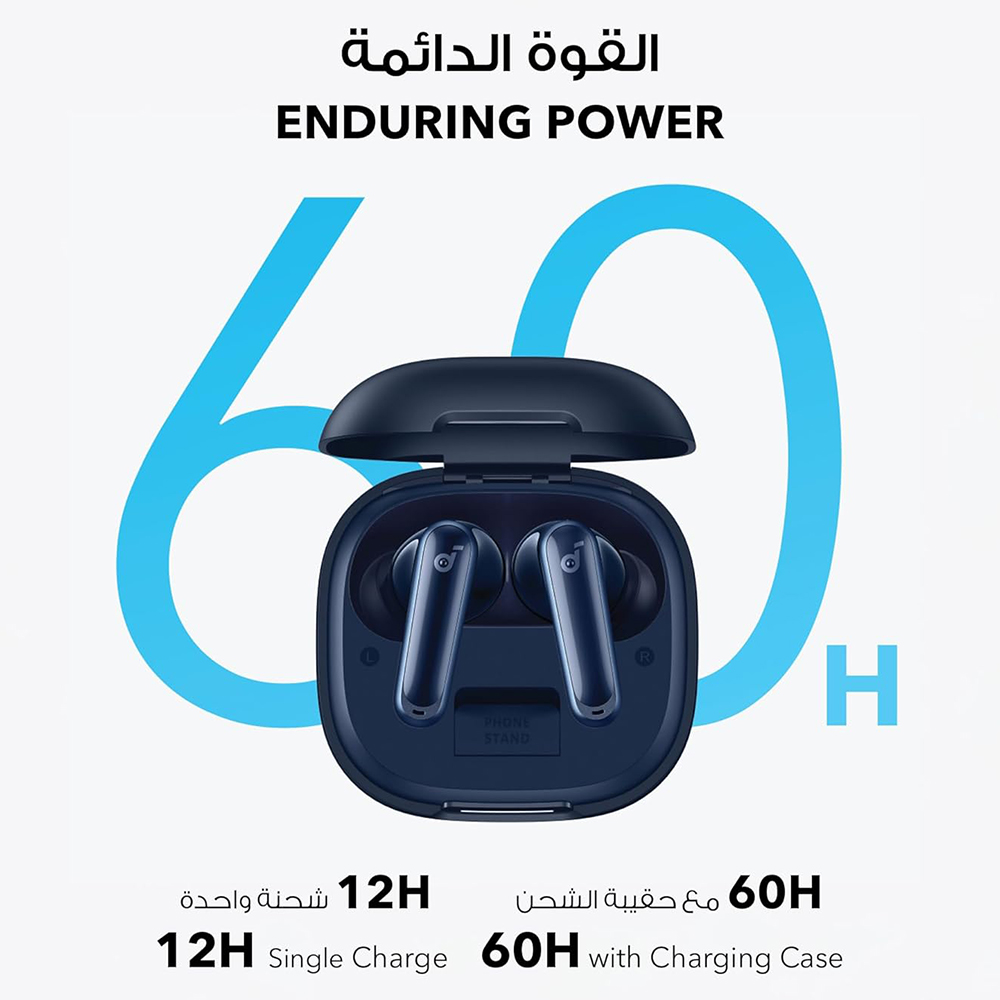 Normal: 12 hours of playtime for earbuds and 60 hours for the charging case. ANC: 10 hours of playtime for earbuds and 50 hours for the charging case. Transparency: 10 hours of playtime for earbuds and 50 hours for the charging case. Calls (ANC Off): 7 hours of use. Calls (ANC On): 6.5 hours of use. Note: Battery playtime is obtained from testing in the Anker laboratory using the earbuds’ default settings, in normal mode, and at 50% volume. The actual playtime may vary by volume, audio source, environmental interference, usage, etc.